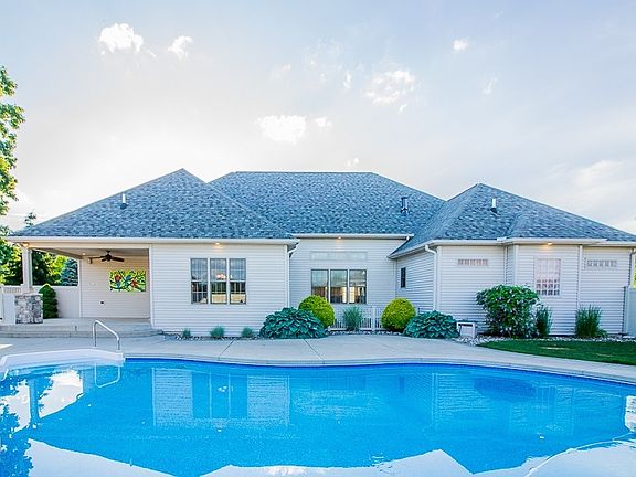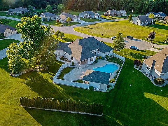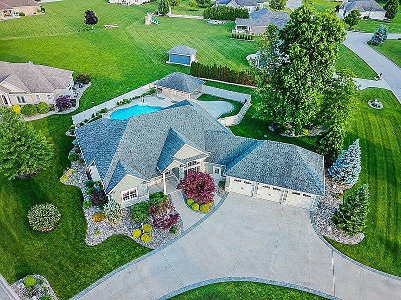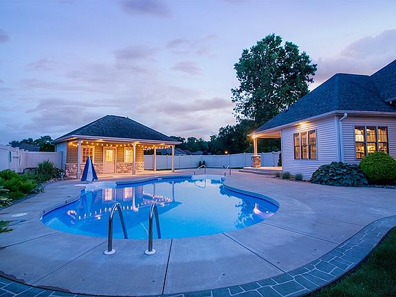 From the main house to the pool house, this build by Troyer Custom Homes is quality, quality, quality. Seller has meticulously maintained this home and grounds. The house sits on an extra-large corner lot, heading into a cul-de-sac. The half-circle drive is super convenient. The home itself features 3 bedrooms on the main level and 3 full bathrooms. The master-bedroom suite has a big walk-in tiled shower, dual vanity and giant closet. There are two more potential bedrooms and another full bathroom on the lower level, making this a possible 5 bedroom home! The main level has a huge, open living room, formal dining room, kitchen with breakfast nook and pantry. The kitchen has custom cabinetry, lots of lighting, an eat-in countertop bar and granite countertops. The laundry room is the stuff of dreams with so much space, cabinetry and built-in ironing board. The mudroom entry off the garage has a convenient storage bench and the garage itself is something to see! There are three stalls, extra storage space and a bonus utility sink. The exterior living space is fully fenced-in. There's a heated in-ground pool, covered entertaining patio and a charming little pool house complete with outdoor shower station. The pool house has two sides, one with a garage door for lawn equipment and a finished side with bathroom, storage and changing area. The finished basement has a theater room with raised floor area for stadium seating. There's a full kitchen and bar, large family room, full bathroom, two bedrooms and tons of storage space. Before you leave, be sure to walk the grounds and appreciate the lovingly-maintained landscaping. There's even a pretty rose garden on one side!