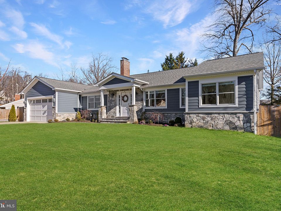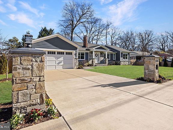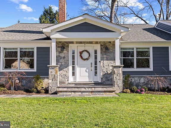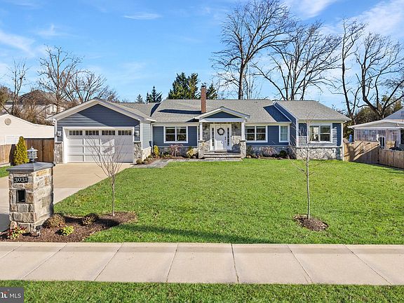 Nestled amidst soaring mature trees and manicured lawns in Falls Church’s tranquil Woodley neighborhood is 3031 Manor Road, a charming mid-century ranch comprehensively reimagined in 2022. Composed of custom, imported stonework, the home's superior architecture has been fastidiously designed and crafted by one of the region’s most acclaimed high-end names. From the street, striking curb appeal is enhanced by a combination of blue hardy plank cement board siding framed by a Carderock Stone water table. The wide driveway is bordered by matching lighted entry pillars traversing the expansive, level front lawn, leading to an inviting portico clad in the same exquisite stonework. A brick feature wall in the entryway sets the tone for the floor plan, comprising five bedrooms and four and a half baths spread over 4,457 finished square feet of newly open-concept, ethereal living space. Premium amenities and meticulous craftsmanship are evident throughout, from the Pella architectural series windows to the family room’s gas fireplace, clad in the same limestone found in Nobu DC. Quarter sawn White Oak hardwood floors extend through the entire home, creating cohesion and complementing the natural light. Tucked off the foyer is a private office entered through a set of French doors, while the classically mid-century living room boasts an artistic painted brick fireplace wall highlighting its stylishly sloped ceiling. At the heart of the home is a true chef’s kitchen. Its high-end appliance suite includes a commercial gas rangetop and built-in refrigerator integrating seamlessly within the cabinetry. Slabs of leathered Italian White Carrara marble are liberally used, covering both the backsplash as well as the stunning oversized centerpiece waterfall island. Open sightlines, integrated bar seating, and a wine fridge enable effortless entertaining within this space. Three bedrooms and three full baths are conveniently located on the main level, including the spacious primary bedroom with a sumptuous ensuite bath. Two additional bedrooms and a full bath are found in the walkout lower level. All bathrooms feature natural stone finishes, including thick marble countertops and glass shower enclosures. Porcelain tile flooring covers the entire lower level, a large space comprising a series of flexible multipurpose rooms. A full kitchen affords further multigenerational flexibility. Out back, the maintenance free trex deck descends into the fully-fenced and completely private usable rear lawn. An automated irrigation system keeps the grounds verdant. Going far beyond skin deep, the extensive renovations encompassed new plumbing and electrical systems, a Tesla charger and recessed lighting in the attached two-car garage, as well as a whole-house Generac backup generator and a full home security system complete with high-resolution cameras. Conveniently situated off Route 50, equidistant from the popular Mosaic District and Seven Corners, 3031 Manor Road blends mid-century character and contemporary living in an elevated package.
