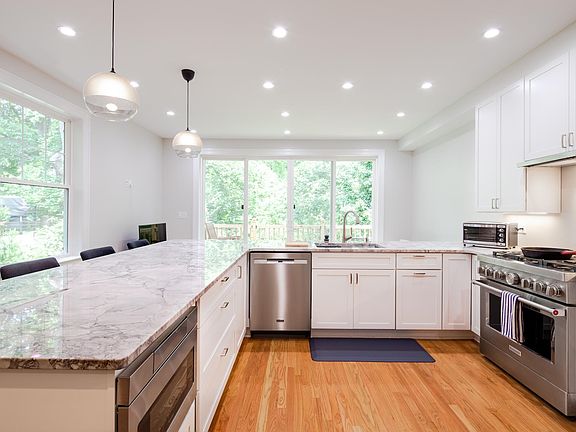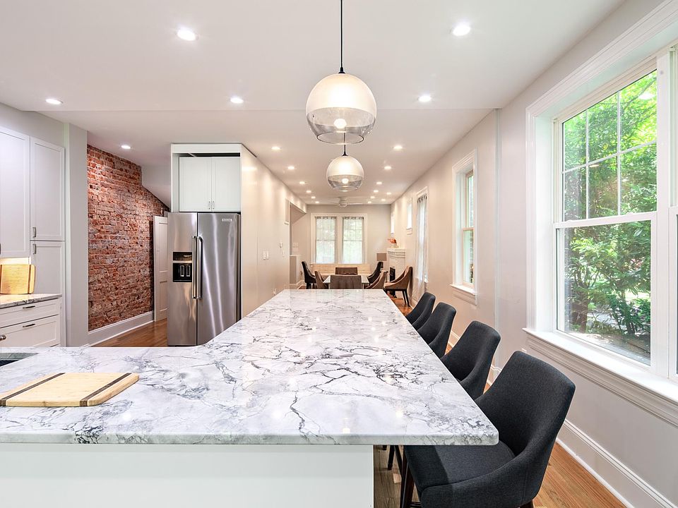 Available on flexible lease terms, including shorter term (e.g. 3-12 months etc.), furnished or un-furnished. Home is available as either as this 6BR/3.5 bath.... or as 4BR/2.5 bath ($1k less, see separate listing). One-of-a-kind fully renovated 6 bedroom/3.5 bath 4-level home with parking. Unbeatable location, family-friendly layout, terrific public and private school access, immediate access to nature and trails, and sheer convenience. Optional furnishings. Pets considered on case-by-case basis. This home is located on a quiet side street off Connecticut Avenue - just a 5-minute walk to the Red Line metro and the many amenities of Cleveland Park's commercial district. Or leave the car in the private driveway and walk a few steps to the trail meandering down into the natural quiet provided by the mature tree canopy and gently flowing tributary of Rock Creek. The MAIN LEVEL features an open and flexible living/dining area with a restored fireplace (wood insert), large breakfast bar (seats 5), cook's kitchen (6-burner dual-fuel stove), 1/2 bath, and expansive rear sliding glass doors that open onto a deck overlooking the great outdoors. The entry foyer has a small entryway closet and nook for storing bags and backpacks. The SECOND LEVEL features 3 bedrooms: a front bedroom with full ensuite bath and a cedar closet; a middle bedroom with closet, and a large rear bedroom with stunning views of the park and larger closet. The hallway bath features a large custom glass shower with two rain-shower heads, a dual vanity, and bright skylight. The hallway's stacked LG washer/dryer and large linen closet make household chores a bit easier. Through a hallway door, take the full-size stairs up to the TOP LEVEL: a large, 'bonus' room with ample sunlight - use as a bedroom, family room, or office. Off the kitchen and passing along the exposed brick wall, stairs lead down to a FULLY FINISHED, full-height BASEMENT living area featuring: kitchenette and its own laundry, three separate and versatile rooms (each with a real window), full private bath, noise-dampening ceiling materials, and separate rear walk-out entrance/exit with brick patio area overlooking the park below. OUTDOOR spaces: front porch w/roof, a rear deck, a driveway that extends into a small historic garage, and basement-level rear sheltered brick patio. Overlooks national parkland and 50 feet from front door is a trailhead to walking paths through the Melvin Hazen park, part of the Rock Creek park. NOTE: Driveway construction scheduled August 2021 (installation of permeable pavers, edging, etc.) Energy/Heat/AC: All new energy efficient windows and doors, tankless gas point-of-service water heater, spray foam insulation, two heating/cooling zones, make this home incredibly energy-efficient, reducing monthly utility costs. An efficient wood-burning fireplace insert with blower is capable of heating significant portions of the house. Smart locks & home security system. Walk Score: 81 (very walkable) Within 5 minutes: dining, Metro, groceries, pharmacies, urgent health clinic, public library, veterinarian, Target, weekend farmer markets, various nature trails. Within 10-15 minutes: National Zoo (free), various embassies, public and private schools (see below 20-30 minutes: Explore Rock Creek Park, Beach Drive, and more. Or head south on the Connecticut Avenue's wide sidewalks to reach downtown business, government, academia, and museums e.g. Dupont Circle, Farragut Square, White House, World Bank, George Washington University & Hospital. 30-40: National Mall and museums Schools & public facilities: SCHOOLS: The home is located within walking distance of its the assigned in-boundary D.C. public elementary school (Hearst Elementary) and various private schools (Washington International School, Burke, Sidwell, Whittle School). It's just a bit further to the in-boundary middle and high schools (Deal MS, Wilson HS). Other private schools including the Maret School, St. Albans, National Cathedral, Georgetown Day - are all within a very short drive/bike. RECREATION: Hearst Elementary School, Playground & Park: A ten-minute walk from the house, the newly improved (Spring 2021) Hearst playground features play structures for a range of ages, including a fenced off area for younger children) and small turf field. In Summer 2021, the adjacent Hearst Park's new outdoor pool, pool house, tennis courts, and regulation-sized soccer field are all slated for completion. All within a 10 minute walk. LIBRARY: Beautifully renovated and re-opened in 2018, the Cleveland Park library is an extensive community resource within easy walking distance (7 minutes). In addition to the comprehensive traditional offerings of the DC Public library, it offers rooms for private study, meetings, and conferences; printing/scanning, desktop computing, high-speed wifi, and a terrific space for kids to play, read, explore. Flexible leasing terms. Furnishings offered on a permanent, partial, or temporary basis. Security deposit required (1 month rent). High speed wifi included. Other utilities covered by tenant. NOTE: The lower-level (basement ) living area can be excluded at a savings of $1000. Pets on case-by-case basis. No smoking in or on property. Rental application and fee ($55 non-refundable fee, government-issued ID, proof of income/resources).