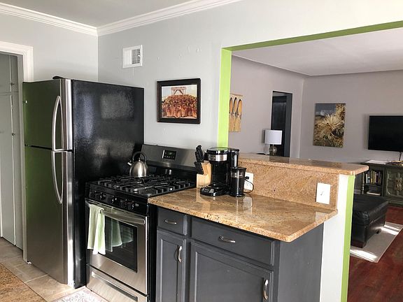 A stone's throw from Mile High Stadium, this adorable ranch home offers city ambience with neighborhood charm. There are two off street parking spaces with the ability to apply for street parking permits for stadium events. There's a wonderful large backyard with loads of potential. The trendy SLOHI neighborhood offers a variety of restaurants and coffee shops within walking distance as well as Sloans Lake. The house has a shabby chic style with bold colors and tasteful finishings throughout. The newly renovated kitchen has stainless steel appliances, a five-burner gas range with oven and granite countertops. This sun drenched south facing room is quite versatile and the elegant curves of the living room walls lend a mid mod touch to the main living room. There are three bedrooms & one could easily become an office depending on your needs. Each room has a window offering lovely natural light. The front of the house is south facing lending beautiful warm light to the common spaces. The home is equipped with a swamp cooler that keeps the space cool and comfortable all summer long. There is a large fenced in backyard that is perfect for pets and gardeners. As avid farmers and gardeners we welcome anyone looking for a nice plot of land to grow food in in the city. Also big enough for backyard chickens and bees. Utilities not included. Pets allowed, no monthly fee.