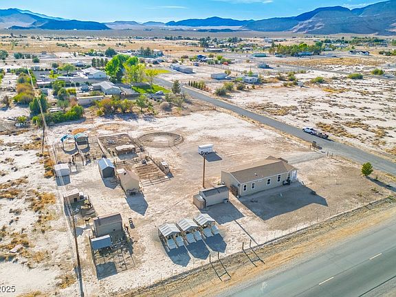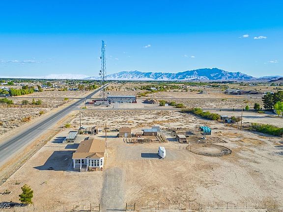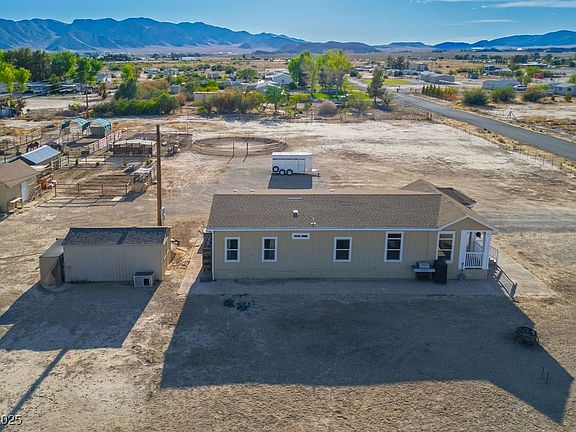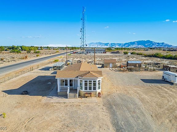 Here is your new homestead in Pahrump! This is a very well-kept home with almost 2 acres of land, and multiple sheds and tack rooms for your chickens and livestock gear! Head inside to the well-appointed kitchen with floor-to-ceiling cabinets and sweeping views of the mountains! Ceiling fans circulate the fresh air, and crown molding throughout lends a touch of class to your farm. Your primary bedroom has a walk-in closet, and the primary bathroom has dual sinks and a spacious tiled shower. Even the laundry room has matching cabinetry for extra storage. Multiple corrals for whatever poultry or livestock you prefer, and you still have about 2/3 of the property for whatever else you desire! Enjoy the dream of rural living, but only 15 minutes from grocery, restaurants and big-box stores in Pahrump!