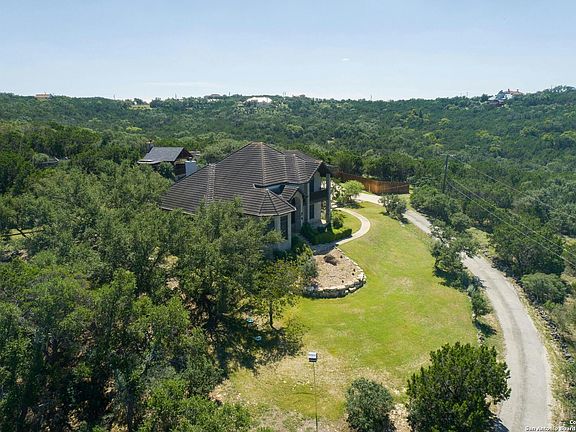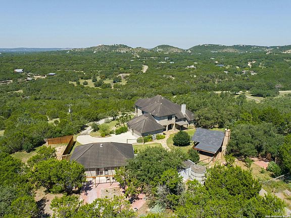 Welcome to your private home in the heart of the Texas Hill Country! Nestled in the prestigious Skyridge subdivision, this 5 ACRE property (5.88 ACRES also for sale, See MLS#1819706) offers the perfect blend of tranquility and nature. Surrounded by mature trees and enveloped in natural beauty with deer and other wildlife, this home offers an unparalleled opportunity to experience the very best of Texas living. You'll love the open floor plan with high ceilings perfect for both relaxing and entertaining. As you enter, you'll be welcomed into a spacious living area featuring a cozy wood-burning fireplace and a convenient wet bar. The spacious kitchen has granite countertops and backsplash, and an island overlooking the living area. The primary bedroom is located on the main floor. The second floor consists of the 3 other bedrooms and bathrooms. Enjoy majestic sunset views from the second floor balcony. Enjoy a beautiful morning in your own library as the natural light shines through the large windows creating an inviting and peaceful ambiance. An additional space including a kitchenette, living area, full bathroom is perfect for accommodating guests. The additional garage has plenty of space to convert into a game room or the freedom to personalize the property to your liking. Indulge in an outdoor experience from the covered pavilion as you gather around the fireplace and enjoy the Texas hill country evenings. This Texas hill country home is close in proximity to restaurants, schools, and entertainment.