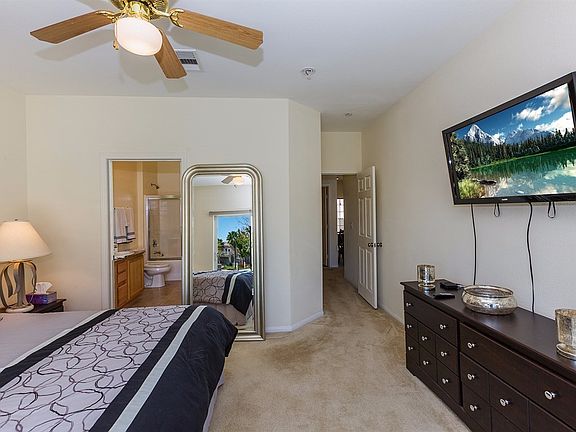 Golf lover's dream condo with the best resort-style living possible for the money. Breathtaking views and spacious living quarters sets you up for loads of fun. Experience fine golfing with Cimarron Golf Resort just steps away and the Desert's shops and restaurants with Palm Springs and Rancho Mirage close by. This 2 bedrooms / 2 bath home is extremely private. A desert landscaped walkway leads you to a formal entry. To the right, a spacious guest suite boasting a private bathroom and its own entrance. Continuing down the hall from the entrance, enter the Great Room with its cozy sitting area with views and exit to the gorgeous complex. The kitchen is an entertainer's delight with maple cabinets, black granite counter tops, a breakfast bar and a dining area. All accented with views of the development. The Master Suite with its sitting area and spa-like bathroom is the ideal retreat to relax and enjoy the views. This property is on fee simple land. Priced to sell.