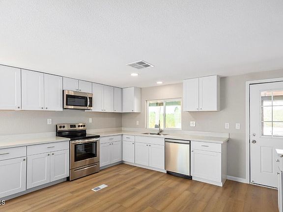 Inside, you'll find a fresh and inviting interior featuring wood-like flooring throughout the main living areas, plush carpet in the bedrooms, modern neutral paint, ceiling fans, and a cozy fireplace—an ideal spot to enjoy the cooler winter evenings. The remodeled kitchen showcases stainless steel appliances, crisp white cabinetry, and granite ...countertops with plenty of prep space.
