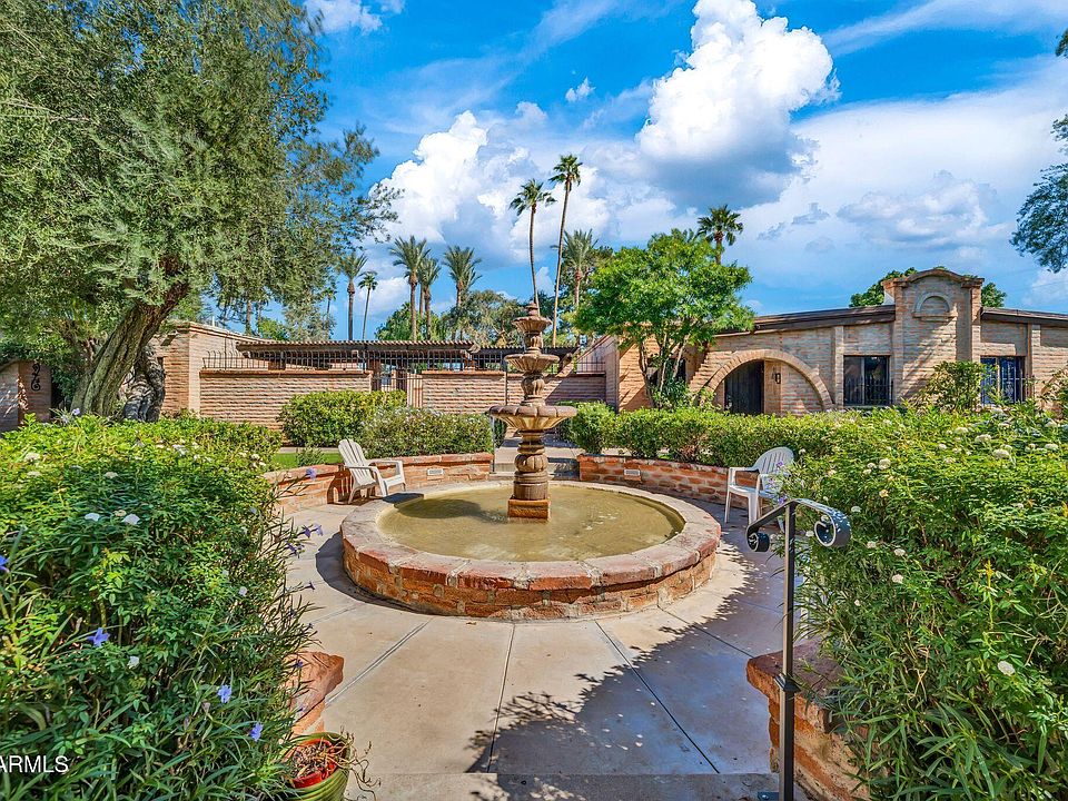 Discover the charm of Spanish Gardens townhouse living, a mid-century historic gem in the heart of Phoenix. This rustic modern 2-bedroom condo offers the perfect balance of low-maintenance living and timeless design. Start your mornings with natural light shining through the skylights and a quiet cup of coffee on your private patio. Spend weekends exploring nearby Arcadia cafés, local shops, and scenic hiking trails. The open floor plan and plank tile flooring create a smooth flow throughout, while the brick accents bring warmth and character. Charming unit tucked in back of community by mature trees, idyllic fountain and sparkling community pool, this townhouse is ideal for anyone seeking charm, simplicity, and the relaxed Phoenix lifestyle just minutes from work and play. Won't last!