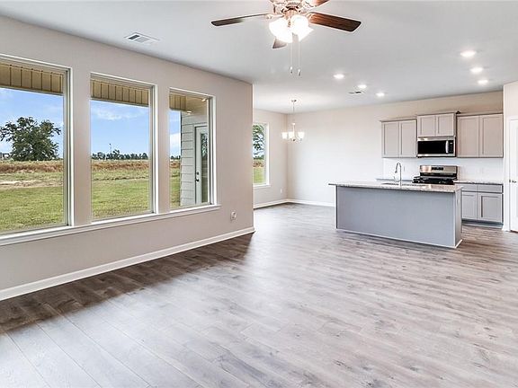 'Vidalia EA' The Vidalia plan has a welcoming flow with 4 bedrooms and 2 baths. The open concept living, kitchen, dining area overlooks a corner back patio that is perfect for relaxing. The kitchen is designed with sleek cabinets, granite countertops and a subway tile backsplash and is equipped with stainless steel appliances that include a gas stove, dishwasher, and micro hood. This home is settled in Ridge at Morganfield, a new construction community with a Homeowners Association. This home comes with a 10-year warranty. All homes offer smart home automation, wood laminate flooring, fully sodded yards, and electric garages with garage door openers.