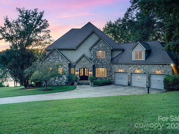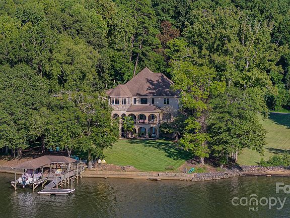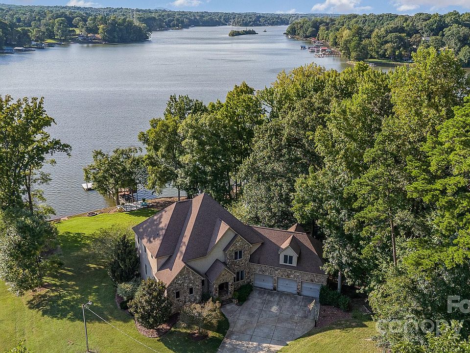 Welcome to this exquisite waterfront residence on the Catawba coast of Lake Wylie—private & serene lake life with stunning Carolina sunsets. Covering over 6,800 sqft on 1.3 acres with nearly 350 feet of pristine shoreline, this property offers abundant space for living and relaxation. The main level includes the primary suite, opening to a vaulted living area with coffered ceilings and access to a patio overlooking the water. Upstairs are three bedrooms with ensuites and walk-in closets, plus a bonus room above the three-car garage. The basement features a bar, guest suite, additional living space, gym/yoga studio, and storage. Glass doors lead to a patio and lawn, perfect for leisure or play, with room for a football field or pool. Just over a mile from the new River District Development, this home is 15 minutes from the airport and 25 minutes to uptown, offering convenience and tranquility. This waterfront haven invites you to enjoy luxury, privacy, and the best of Carolina living.