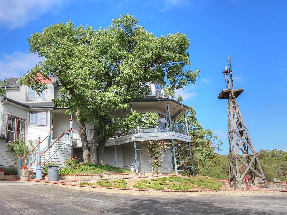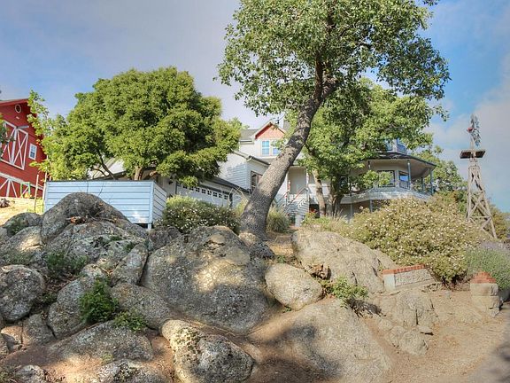 PRICE REDUCED! Beautiful Victorian style two-story home. One bedroom on main living floor. Additional bedrooms upstairs. Quality throughout this custom built home. built-in custom cabinet work, detail and pride in ownership. Spectacular views from home and large deck. Gorgeous property with oak trees and granite outcroppings. Two story 1800 square foot shop with addition of auto paint booth.