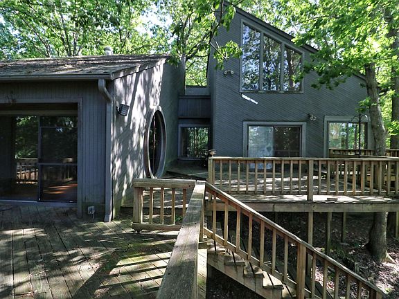 Step into this beautifully designed architectural gem. With just a few updates, this home will be everything you want and more. From the deck access in almost every room, to the above garage space, you will fall in love with the possibilities that this property could be. Plus with 25 acres of wooded land on which you can hunt, it's a perfect setting for wildlife as countless deer are seen daily! Come see it today!