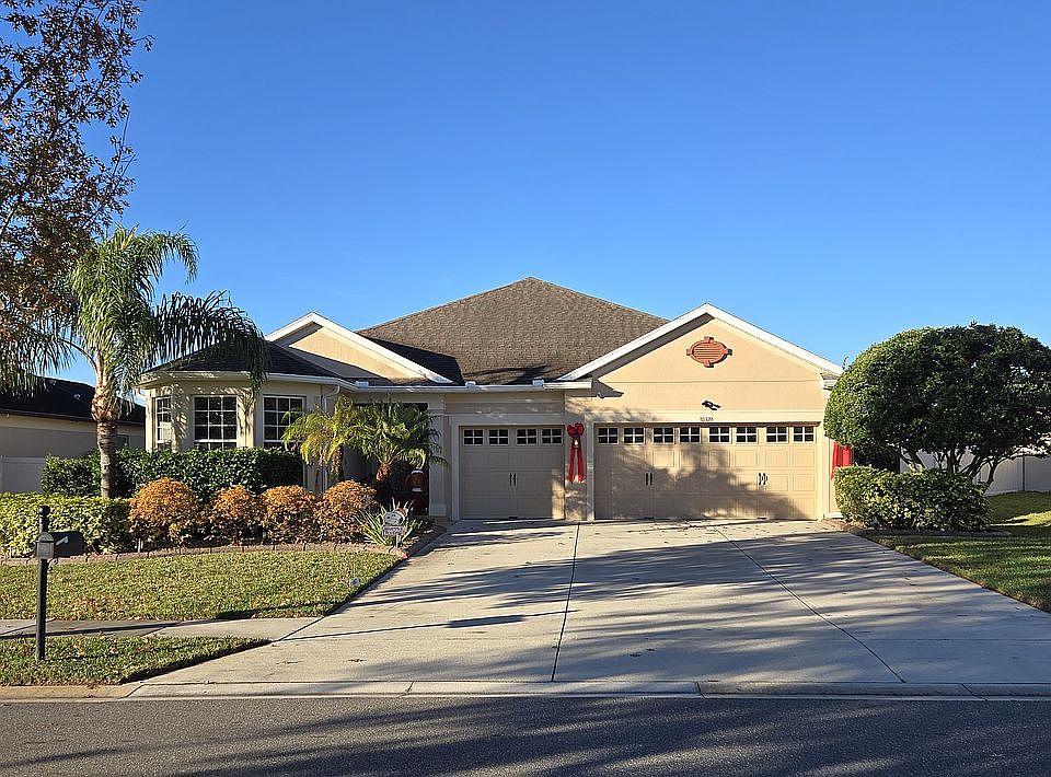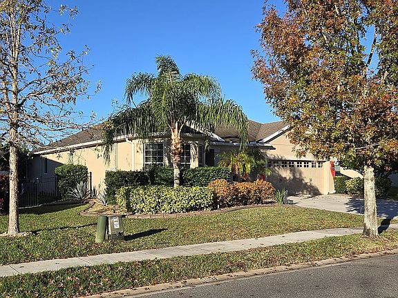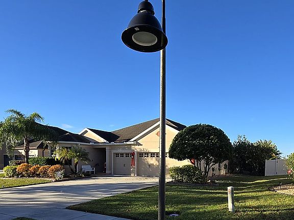 Entering the home through the upgraded custom glass door you are met by a large Foyer leading to an impressive open floor plan with volume ceilings and 20 inch travertine style ceramic tile and custom shutters throughout as well as silhouette room darking blinds in the great room. Large eat in kitchen with granite tops and stainless appliances. Two Islands for food prep and entertaining for the Chef. Center of home boasts a floor to ceiling stacked stone 72" maintenance free horizontal electric fireplace. Great room with French doors leading to covered lanai and salt water pool. Lanai has a new 19' x 10' motorized awning to help cool the Florida summers that extends partially over the pool. Boasting 3 private 3 bed 3 bath en suite's placed on opposite corners of the home for private accomodations Master has large walk in closet plus an office which could be a 4th bedroom. Frontyard had $7,000 makeover 11/25. Premium elevated lot with great views, backyard is fenced and private surrounded by mature tropical lush vegetation. 3 car attached garage with epoxy flooring one bay curently converted to enclosed gym. Upgraded underground spinkler system, New A/C and Furnace 2025. Peaceful neighborhood with low HOA and nice amenities.