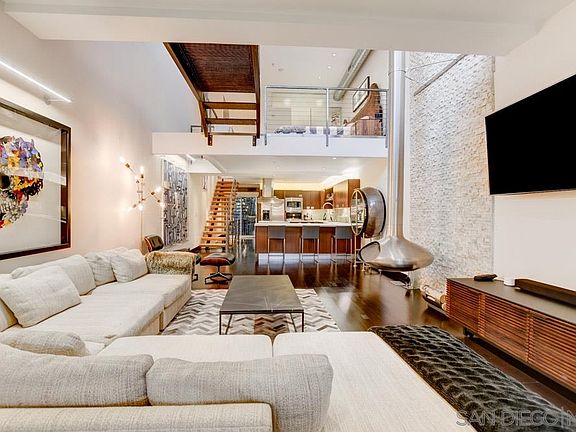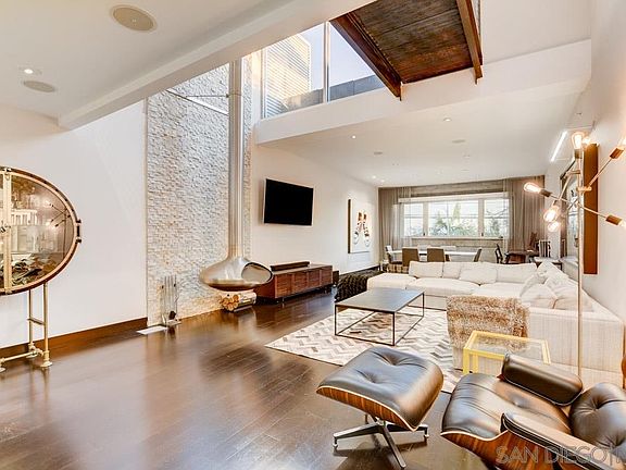 Mid-century Modern Sophistication with panoramic water views. This unique 3 level loft has high ceilings and caters to a flexible living style. Custom floating stairs, 1st floor family room/office, with an open floor-plan kitchen looking into the expansive living room and a sizable dining room. Beautifully designed master bedroom on the entire 3rd floor; walk-in closet, newly remodeled master bathroom, and an iron catwalk to the huge rooftop deck. Views overlooks into the San Diego Bay and Downtown.