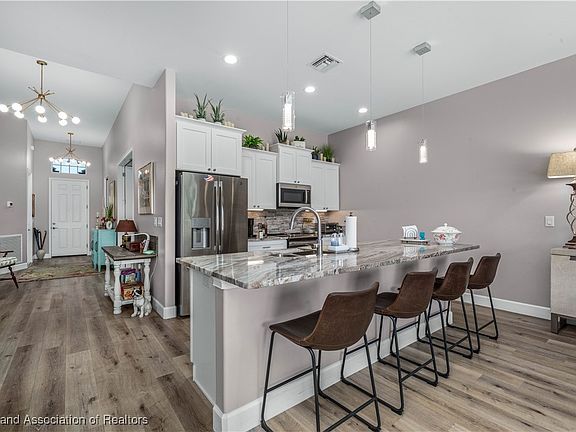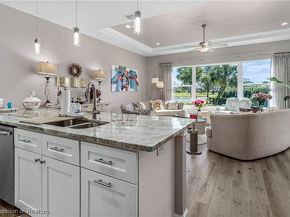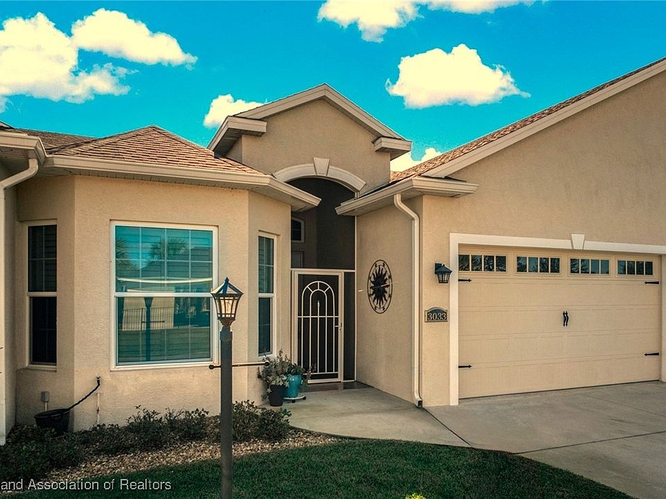 GORGEOUS! FURNISHED! LOTS OF UPGRADES including impact windows, plantation shutters, custom drapes, solar powered roll-up shade screens in the lanai, sealed/painted epoxy floor in lanai and garage, huge built-in storage cabinets in garage, screened-in front porch and added elegant light fixtures in the kitchen, dining and foyer. This move-in ready beauty has captivating water views overlooking the pond and Hole #16 of Deer Run course. Boasting just under 1,900 sq. ft. of living area with a split floor plan, lots of recessed lighting on dimmers and double doors lead to the spacious bonus room that could be ideal as an office or den. Wonderful Great Room with spacious dining area, grand living room and an amazing kitchen. You'll love the high-end granite, large center island with breakfast bar, stainless appliances, under-cabinet lighting, pull-out shelves and pantry. Nice master bedroom with luxurious ensuite featuring high-end granite double sink vanity, modern walk-in tile shower, linen closet, water closet and walk-in closet. Convenient indoor laundry room with cabinets, matching granite countertop and washer and dryer included. Great location! Just across the street from it all: the pool, grilling area, guest parking and located near the end where there's very little traffic. HOA fee covers use of amenities, lawn care and exterior maintenance including painting and pressure cleaning. Rentals allowed. Two pets allowed, up to 60lbs combined max weight. The special district fee covers the upkeep of the community and roads of Sun N Lake and 24 hr security of the community.