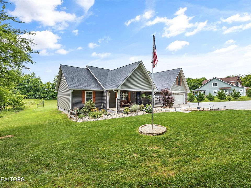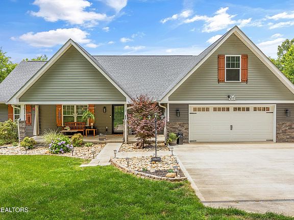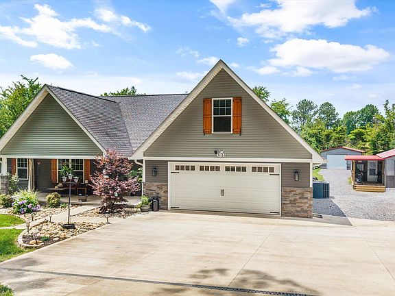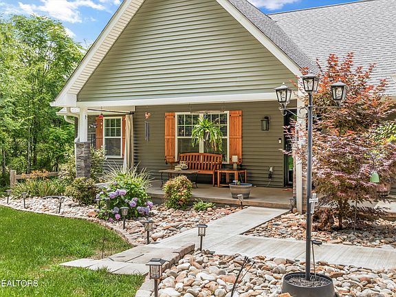This stunning 4-bedroom, 4-bathroom home offers just over 3,000 sq ft of thoughtfully designed living space with a desirable split floor plan. Situated on nearly an acre in a quiet neighborhood near Sevier County attractions, it perfectly blends comfort, style, and convenience. The open-concept kitchen showcases granite countertops, a spacious butcher-block island, and flows seamlessly into the great room, where vaulted tongue-and-groove ceilings and high-end LVP flooring create warmth and charm. A versatile bonus room with a 4th full bath and additional sleeping area is ideal for guests, a playroom, or a home office. Step outside to enjoy the peaceful setting—relax on the covered front porch, entertain on the expansive back deck, or unwind in the hot tub beneath the gazebo. The nearly one-acre lot backs up to the 9th fairway of the golf course and includes a stamped concrete patio with fire pit, mature fruit and nut trees, and plenty of outdoor living space.