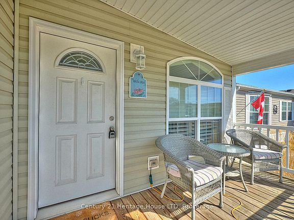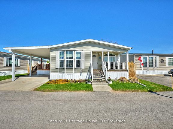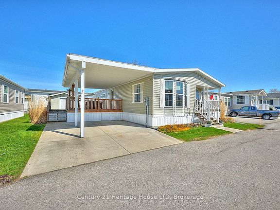 Oversized 3 bedroom, 2 bath bungalow nestled in desirable Black Creek Community, where residents will enjoy a Community Centre/Club House, indoor and outdoor pool, sauna, tennis courts, shuffle board courts, library, etc. You'll love the weekly community activities including dancing, bingo, yoga and more! This spacious and modern home was built in 2013 and is move-in ready. The modern kitchen features an abundance of counter and cabinet space, a large breakfast bar, and open concept design overlooking the spacious dining area. The living room features a cozy gas burning fireplace. This unit offers large windows throughout providing plenty of natural light. The primary suite offers a large walk-in closet and ensuite. This home is carpet free, with all modern flooring throughout. Other features include, a separate laundry room/mud room, custom California window shutters, covered front porch, large tiered covered deck and lower uncovered deck where you can enjoy lots of sunlight, carport, and storage shed. Don't miss your opportunity to own one of the nicest units in this friendly Black Creek Community! Land lease is $825 per month and estimated monthly property taxes for site and home is $256.07