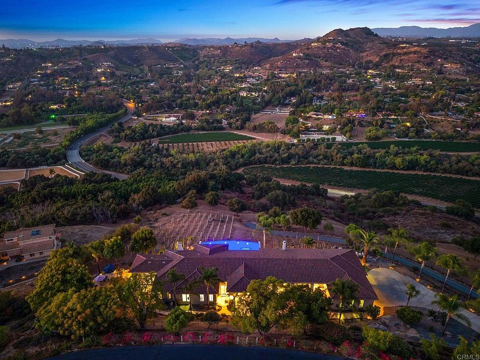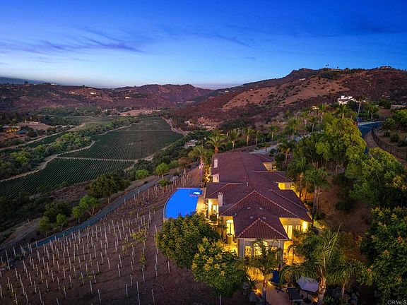 Imagine a place where every day feels like a luxurious escape—a private sanctuary bathed in California light, seamlessly blending the elegance of the Mediterranean with the tranquility of Wine Country. Welcome to Sol Toscano, or "Tuscan Sun," a magnificent single-level estate gracefully set atop the rolling hills of Hialeah Rancho Estates. This over 4,000 square foot retreat is designed for the discerning individual seeking timeless refinement and absolute serenity. Here, on 4.4 acres of exquisitely landscaped grounds, panoramic vistas of Moody Creek Vineyards and the tranquil valley below transform every sunrise and sunset into your personal, private masterpiece. Your journey begins at the custom automatic gate (installed 2023), which unveils a landscape reimagined by the masterful touch of Tomas Ramirez. Over 400 flourishing dragon fruit trees surround the magnificent infinity-edge pool, creating a unique and vibrant orchard backdrop. Meander along incredible stone paths that lead to secluded seating areas and a sculptural Stonehenge garden. As dusk settles, new outdoor sconces cast a warm, enchanting ambiance across the entire estate. Inside, Sol Toscano is a masterclass in elevated comfort and bespoke craftsmanship. The home was fully repainted in 2023, providing a clean, refined canvas for warm finishes, custom millwork, and designer lighting. The boundary between indoors and out dissolves with expansive Fleetwood doors and windows, featured in the living room, front entry, and the primary suite’s trifold door, offering sweeping views from every angle. At the heart of the home is a chef’s kitchen, completely remodeled in 2025. It's a statement of performance and sophistication, featuring bold black velvet granite countertops, a central gathering island, and an all-new suite of high-end Café appliances. The private east wing is dedicated to the tranquil primary suite. Its spa-style bathroom, fully renovated in 2023, is a true sanctuary—boasting dual rain showers, a deep soaking tub, and a stunning Starlix glass enclosure that evokes a luxurious, resort-like experience. A custom walk-in closet adds both practicality and elegance. The west wing offers two beautifully remodeled guest en-suites (one featuring a new pedestal sink) for unparalleled hospitality. This wing also includes a separate laundry area and a versatile bonus room, anchored by a custom home office with built-in cabinetry and its own secret garden nook—ideal for quiet work or creative retreat. The true centerpiece of Sol Toscano is its resort-style outdoor haven: a 40-foot saltwater infinity pool and spa that seems to flow effortlessly into the valley below. Upgraded with a modern self-regulating system, enhanced heating, and a beautiful Pebble Sheen surface, this poolside escape is both low-maintenance and irresistibly indulgent. Every detail for modern convenience has been meticulously addressed: a new dual-zone HVAC system, whole-house generator for peace of mind, upgraded water heater, and restored fireplaces. The three-car garage features newly finished epoxy flooring and EV charging capability. Integrated indoor and outdoor sound systems and statement lighting complete this exceptional property. Sol Toscano is more than a home; it is a curated, graceful lifestyle waiting to be enjoyed in one of Bonsall’s most breathtaking and refined settings.