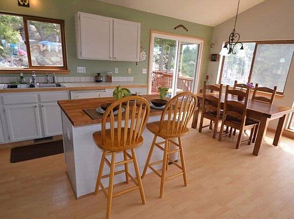 Desirable true Great Room floor plan, vaulted, wood stove, 2 walls of windows capture beautiful mountain vistas and snowcaps. Private usable 1 acre positioned for south and west exposure. The large Master accepts a king bed with in-suite bath. Bedroom #2 is across the hall. The garden level family room offers a tall ceiling and tile flooring. Adjoining is the 3rd bedroom with in-suite full bath. The two car tuck under garage offers ample parking and storage. The driveway is paved. From the front deck see mountain views. From the spacious rear deck a wonderful oasis of unique rock outcroppings unfolds. Owner has completed safety zone tree mitigation. Elk Creek Elementary is 10 minutes away as is the RTD commuter bus and Conifer shopping. Close to hiking and biking and the new Staunton State Park.