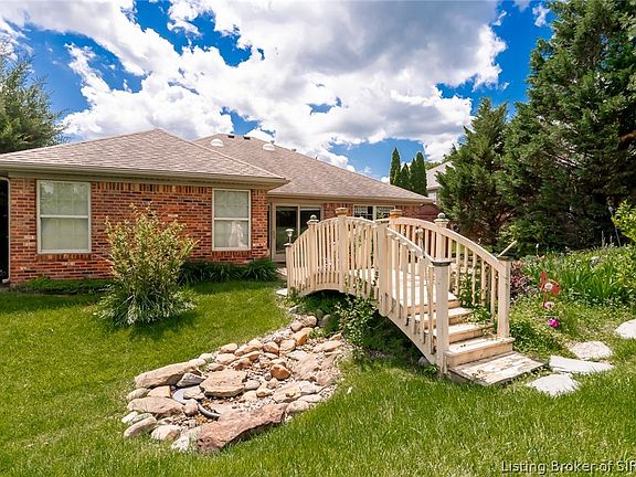 OPEN HOUSE, Sunday, 5/5 from 2 PM - 4 PM! Come tour this well maintained home with 3 bedrooms, 2 full baths and no steps! All brick, stand alone patio home with no HOA fees! Handicap accessible! The large 2nd bathroom is set up with a walk-in tub! As you enter the front door, you'll love the open space! Large wide front foyer with ceramic tile that flows into the living room with vaulted ceilings, gas fireplace, and built ins! The living room opens to the formal dining room and the kitchen along with the flex space that can be used for a sunroom, den, or office! That open room walks out onto the rear patio with views of the landscaped back yard! Watch nature as you enjoy your koi pond and wood bridge! Back inside, the spacious dining room is ready for you to settle in! The kitchen features a breakfast bar and plenty of cabinets! All the kitchen appliances stay along with the washer and dryer! The mud room is off the kitchen with a large pantry and the laundry! The primary bedroom has double walk-in closets and a sliding door that opens onto the patio as well! The en-suite bathroom has double sinks and a jetted tub/shower combination! Off the hallway are 2 good size bedrooms and the 2nd full bathroom! Lots of natural light throughout the home with 5 skylight tubes! This great home is ready to move in and it's convenient to all of Southern Indiana and Louisville! Call today before this terrific property is SOLD!