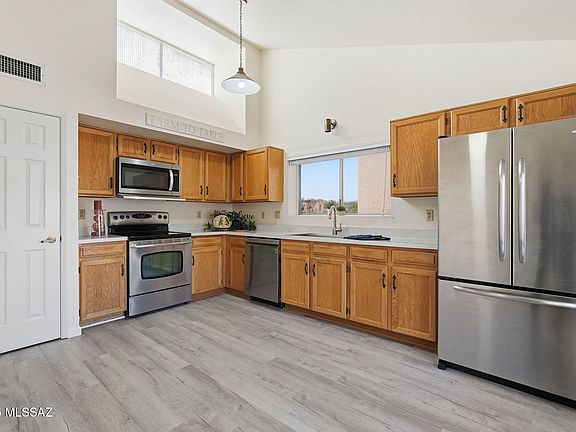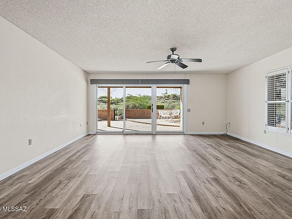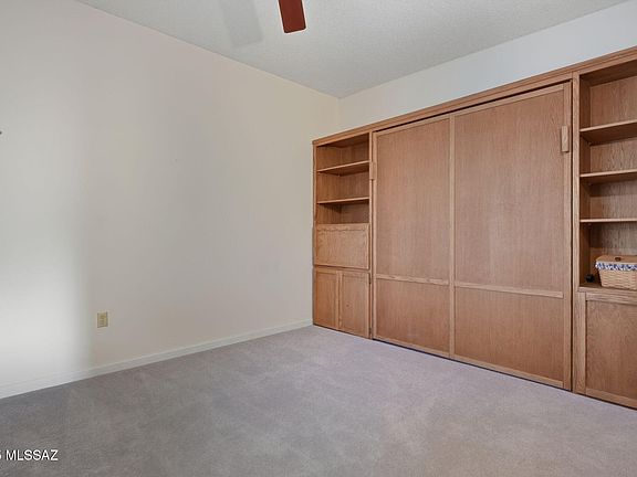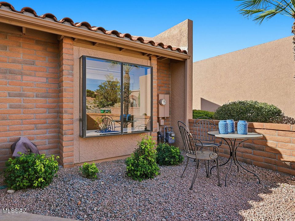 Soak in the beauty of the Santa Rita Mountains from your spacious back paver patio, an inviting outdoor retreat perfect for sunrise coffee, evening sunsets, and year-round desert living. Inside, the bright kitchen captures the charm of AZ with skylights, a garden window, and SS appliances. The open LR/DR features a newer south-facing slider wall of windows, also enjoyed in the primary bedroom, filling the home with sunshine and framing those classic desert skies. Your guests will love their own versatile space, complete with a wall bed, built-in desk, generous storage, and a window overlooking the private front courtyard. An oversized 2-car garage with abundant storage cabinets ensures room for all your gear, and desert essentials. This TH is ready to be your ''Home Sweet Desert Home''.