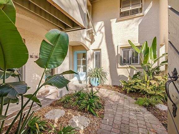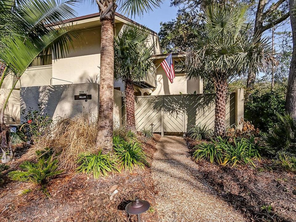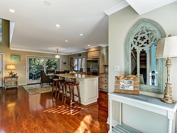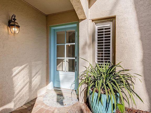 This 2 BR/2 BA 2-story villa is gorgeous!!! The floor plan is open, featuring vaulted ceilings in the living room and a built-in entertainment center. The custom kitchen includes custom cabinetry, granite countertops, stainless steel Kitchen Aid appliances, as well as a large center island which is open to the dining room. Attractive hardwood floors flow throughout the downstairs. The patio offers a brick paved sitting area with a serene wooded view. The powder bath includes a granite counter top and elegant lighting. Upstairs, the master suite features a private balcony, updated bath with plantation shutters, and travertine floors. The guest room has a private bath, a balcony & a walk-in closet. This end unit villa is a short distance from the beach and is near shopping, dining and the spa. New AC unit in 2016! Most furnishings are negotiable, with the exception of the living room furniture.