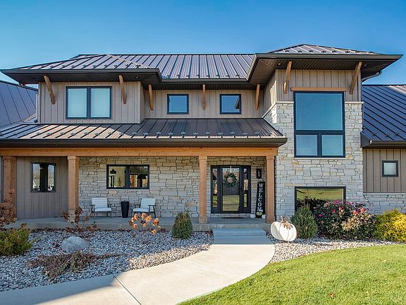 Beautifully designed, modern “Texas Ranch” style home sits on over 2 acres in the private gated community of Blackhawk. This home has outstanding custom quality and many upgrades both above and below the surface. The extremely functional, spacious floorplan, designed by HELMAN SECHRIST Architecture, perfectly lends itself to family living and entertaining with ease. Inside the home throughout the main floor is white oak hardwood flooring, quartz countertops, custom metal detailing and rustic Alder cabinetry, lending the home a unique industrial yet cozy, welcoming atmosphere. The open concept eating/living/dining area includes a Kitchen that is a cook’s dream; giant quartz island, double oven and large range with custom metal hood above, gorgeous ceiling-height custom cabinetry, custom metal open shelving, large walk-in pantry, and stainless appliances. Right off the Kitchen is a large Dining area, a vaulted ceiling Sunroom with loads of natural light and a complete wet bar with under counter fridge nearby. The Living Room has a sleek modern fireplace with space for TV above, custom metal accents, and custom cabinetry below. In the rear of the house is a home Office with an abundance of cabinetry storage, a huge main floor Laundry room, Powder Room with linen storage, and a Mudroom perfect for families; 4full-sized cubbies with USB and electrical outlets, large U-shaped bench, and “drop zone” with counter space and cabinets above and below.Back area also has a separate door to back yard, perfect for animals to be let in and out or for kids coming inside from the pool. The main-floor Master Bedroom features sliding doors that open up to the back patio and hot tub. Master Bathroom includes a private toilet, free-standing tub, plentiful cabinetry, and a curbless walk-in shower with incredible tile feature wall. Master Closet is completely built-in with cabinets, drawers, hanging space and shoe racks. Leading upstairs is the staircase tower off the foyer, made of custom metal and floating wood treads in front of a giant wall of windows, offering tons of natural daylight. The second level includes one spacious en-suite Bedroom and Bath with quartz tops, double sinks and shower, two more bedrooms with a Jack & Jill Bath with quartz top and double sinks, and a second level Laundry Area with counterspace and laundry tub. The completely finished basement has durable LVT flooring throughout.