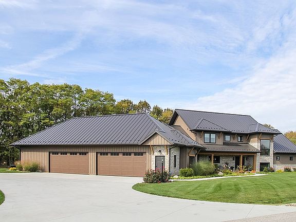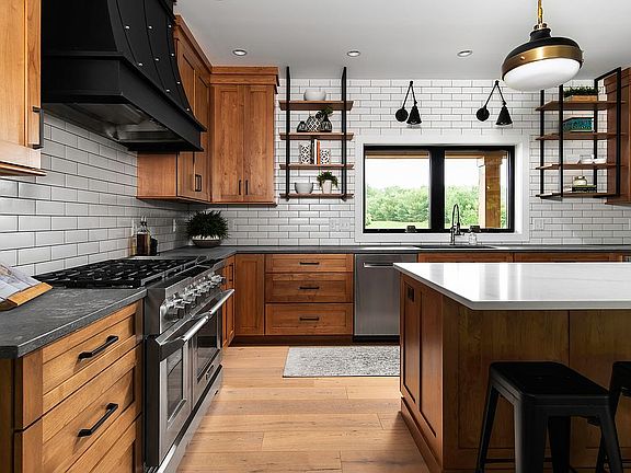 Beautifully designed, modern Texas Ranch style home sits on over 2 acres in the private gated community of Blackhawk. This home has outstanding custom quality and many upgrades both above and below the surface. The extremely functional, spacious floorplan, designed by HELMAN SECHRIST Architecture, perfectly lends itself to family living and entertaining with ease. Inside the home throughout the main floor is white oak hardwood flooring, quartz countertops, custom metal detailing and rustic Alder cabinetry, lending the home a unique industrial yet cozy, welcoming atmosphere. The open concept eating/living/dining area includes a Kitchen that is a cooks dream; giant quartz island, double oven and large range with custom metal hood above, gorgeous ceiling-height custom cabinetry, custom metal open shelving, large walk-in pantry, and stainless appliances. Right off the Kitchen is a large Dining area, a vaulted ceiling Sunroom with loads of natural light and a complete wet bar with under counter fridge nearby. The Living Room has a sleek modern fireplace with space for TV above, custom metal accents, and custom cabinetry below. In the rear of the house is a home Office with an abundance of cabinetry storage, a huge main floor Laundry room, Powder Room with linen storage, and a Mudroom perfect for families; 4full-sized cubbies with USB and electrical outlets, large U-shaped bench, and drop zone with counter space and cabinets above and below.Back area also has a separate door to back yard, perfect for animals to be let in and out or for kids coming inside from the pool. The main-floor Master Bedroom features sliding doors that open up to the back patio and hot tub. Master Bathroom includes a private toilet, free-standing tub, plentiful cabinetry, and a curbless walk-in shower with incredible tile feature wall. Master Closet is completely built-in with cabinets, drawers, hanging space and shoe racks. Leading upstairs is the staircase tower off the foyer, made of custom metal and floating wood treads in front of a giant wall of windows, offering tons of natural daylight. The second level includes one spacious en-suite Bedroom and Bath with quartz tops, double sinks and shower, two more bedrooms with a Jack & Jill Bath with quartz top and double sinks, and a second level Laundry Area with counterspace and laundry tub. The completely finished basement has durable LVT flooring throughout.