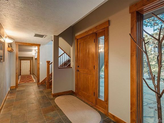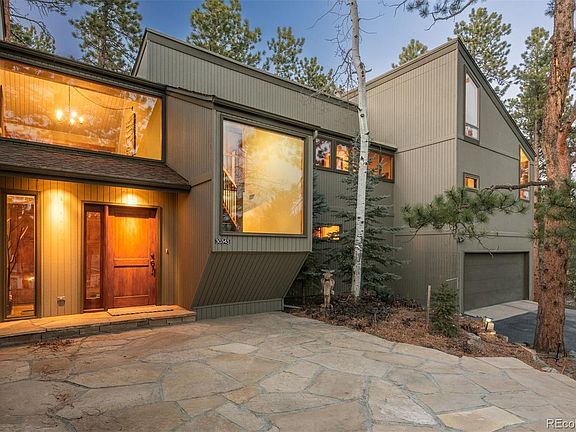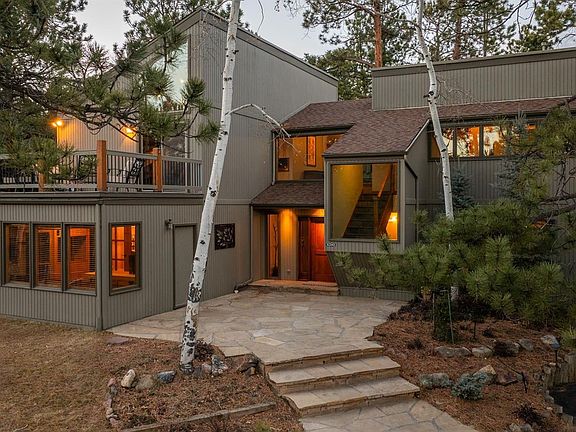 Fantastic location at the end of a quiet private cul-de-sac in Hiwan! Raised ranch mountain contemporary offers an aspen lined south-facing driveway, architectural interest and wonderful outdoor living spaces - multiple synthetic decks, front and back patios, and a fenced back yard planted in perennials to create a colorful sensual oasis in the summer months. Full of natural light from its many newer windows, wonderful family home features a vaulted main level finished with tongue 'n groove ceilings and cherry flooring. Remodeled kitchen is open to the living room with a free-standing gas fireplace atop a flagstone pedestal, broad front deck and a recessed conversation area with built-in seating. Expansive slab granite kitchen countertop provides bar seating ideal for entertaining. Kitchen is finished with cherry cabinetry, 5-burner induction cooktop, double ovens, wagon wheel metal pot rack, specialty lighting and a butcher block topped side bar. Office niche adjoins the kitchen creating a private work space with built-in desk and filing cabinets, leathered granite counters and access to the back deck and yard. Large formal dining room is just off the kitchen. Two vaulted bedrooms share a lovely remodeled skylit 3/4 bath with stone countertop, vessel sinks, heated floor, frameless shower door and river rock basin. Spacious vaulted primary suite has a private deck, roomy loft and remodeled 5-piece bath with heated tile floor and soaking tub. Lower level consists of an immense family room with wood-burning stove, conversation area with built-in seating plus access to flagstone patio and yard. French doors open to sunroom surrounded by wood walls and ceiling with slate floor, exterior door and Finnleo sauna. 2nd office looks out to the garden. 4th bedroom is next to a remodeled 3/4 bath. Large laundry doubles as the center for an active family's equipment storage and includes a sink and folding area. Alder doors and trim plus hand-trowel texture through out.
