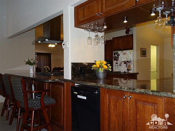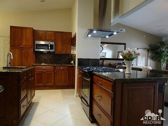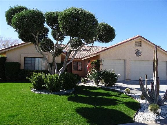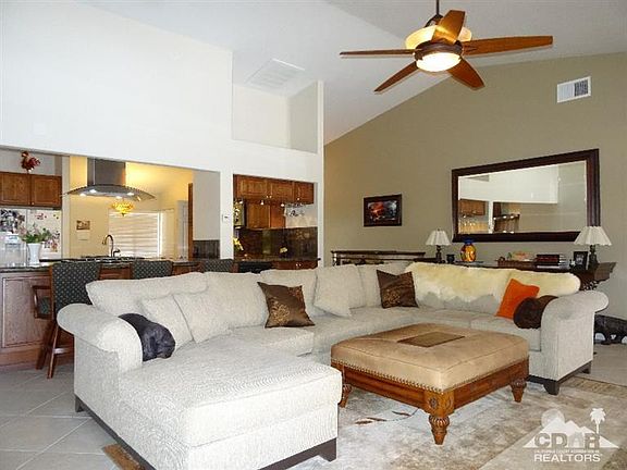 This extraordinary home host one of the largest floor plans in the highly sought after Landau Homes Development. Walk in the entry way to find 20 inch ceramic tiled flooring, vaulted ceilings with niches, recessed lighting, skylights,ceiling fans, fireplace, beautifully remodeled kitchen with oak cabinets, granite slab counters & back-splash, two breakfast bars, formal dining room, breakfast nook, bar area complete with refrigerator. The main master bedroom sits to the right with all other bedrooms opposite side of home giving great privacy. Both Master Bedrooms have sliding glass doors that open to the covered patio. Once out on the patio you will see majestic views of Mt.San Jacinto, San Gorgonio and Santa Rosa mountain ranges. The double bar electric guitar salt water swimming pool completes this special home. Unique exterior with an elegant interior combined with close proximity to shopping, restaurants, golf and entertainment throughout the Coachella Valley.