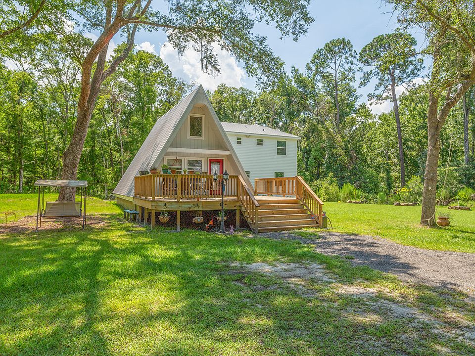This unique 3BR / 3BA Home begins it's story with the original A Frame house that has been converted to a living room with loft above that is perfect for guests or an office. This home continues to grow with a new addition from 2015 that adds 3 large bedrooms, additional bathrooms, a dining room, and an open Kitchen. The kitchen has a propane gas range, stainless appliances, and granite counter tops. There is a tankless Rinnai Hot Water Heater and the HVAC is from 2016. There is a large deck at the front of the house, as well as the back, for all of your family gatherings. The air conditioned shed makes a wonderful office or guest quarters, and the 1500 sqft Quonset is set up for a workshop already complete with 3 Phase power.