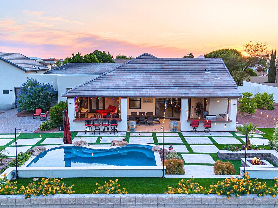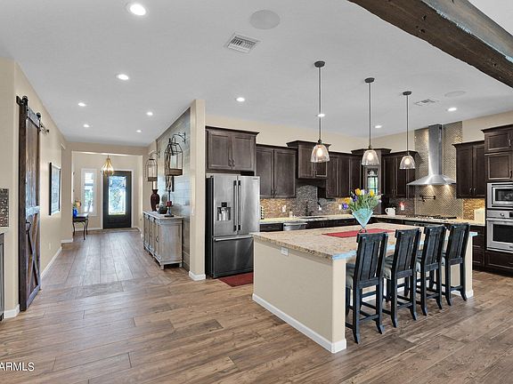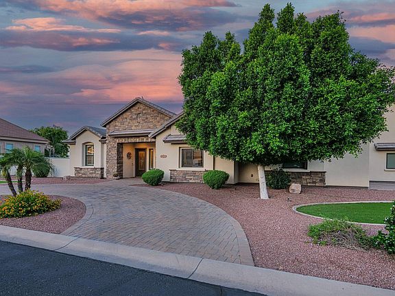 Nestled in the custom gated neighborhood of Montana Dorado on a large culdesac lot with circular drive, this custom-built beauty is more than just a house—it's a lifestyle. Step into an entertainers dream home as you explore the expansive backyard oasis, including outdoor waterfall pool, lighting, built-in bbq, fire pit or enjoy the ample space for all your yard games including horseshoes, & designated corn hole space. Orchard includes lemon, lime, grapefruit and orange trees. Backyard also includes a dance floor and large turf area for any event! There is also a fenced off part of the yard with an RV gate prefect for additional outdoor storage. Inside, indulge in comfort and elegance with a spacious flexible open floor plan. Chefs kitchen includes Frigidaire appliances, double ovens, and a large island including seating and an adjacent wet bar. Open to great room/dining room flowing to the exterior playground. Easy care tile wood flooring throughout, custom lighting & tons of storage! Primary suite designed to be your personal sanctuary. Enjoy the convenience of two closets opening to large laundry room. Pamper yourself in the spa-like bathroom featuring a generously sized shower and a luxurious soaking tub, two separate vanities and separate water closet. Two guest bedrooms offer bench seating, walk in closets and plantation shutters and separate 4th bedroom/office offers flexibility for every buyers need. This home is a car enthusiast's dream come true! With a 4-car garage equipped with wiring for two electric cars and air conditioning, it is also a workshop and has a separate air conditioned storage space and additional walkable attic storage