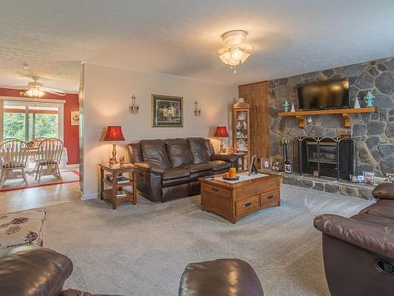 This lovely home sits on over a acre and offers a beautiful country scenery for miles. Features 3 Bedrooms, 3 Full Baths, a spacious kitchen with lots of cabinets and all appliances, a large bonus room in basement, 2 stone fireplaces, nice landscaping, 2 car drive under garage, a huge detached 2 car garage that also can be used as a work shop. Several updates in the last 3-5 years include metal roof, water heater, heat pump, windows, some flooring, the 3rd bathroom and new paint throughout home. Call for appointment today!