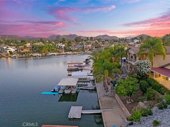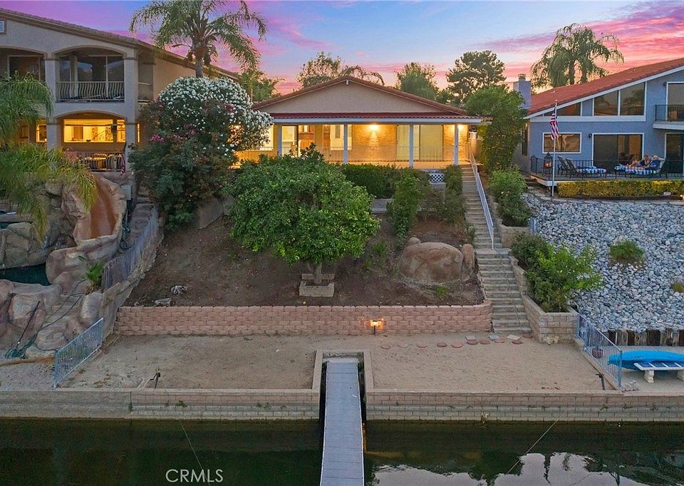 Back on the Market & Ready to Sell! WATERFRONT home on the East Bay with 50' of lake frontage & great lake views! Light and bright single story home featuring 3 bedrooms, 2 baths, almost 1700 square feet, & a private boat dock across the bay from Indian Beach. Great curb appeal with stone entrance & leaded glass front door & side windows offering lots of light. Nice floorplan with wide entry opening to the living room & kitchen. Remodeled kitchen with new white quartz countertops, white cabinetry, new staniless steel sink & faucet, new hardware, & great garden window. Large island with breakfast bar on 2 sides that opens to the dining area with ceiling fan & living room featuring large stone wood-burning fireplace with hearth & forced air heating grate that pumps the heat in making it perfect for the winter. Lake views from the living room with glass slider leading to the covered back deck & 1 level down to the lake. Master bedroom with lake views offers dual closets & large slider leading to the back deck & lake. Remodeled attached master bath features brand new dual sink white vanity with stone counters, new plumbing, new mirrors, new light fixtures, new toilet & tub/shower combo. 2nd bedroom in front of the home offers a bay type windows with built-in window seat & storage. Remodeled 2nd bath offers a new white vanity with stone counters, new plumbing, new mirror, new light fixtures, new toilet, & walk-in shower. Ceiling fans & mirrored closet doors in all the bedrooms. New ceramic tile throughout the home. Attached garage is super clean with painted flooring & is perfect for 1 car & a golf cart. Laundry is in the garage with storage & sink. The lake is only 1 level down from the home making it super easy to enjoy! The backyard offers several tiers including a sandy beach, lots of fruit trees (orange, grapefruit, & lemon) & private boat dock. The perfect waterfront home on a great street that is centrally located within the community & the perfect location on the lake with easy access to the main lake. Lots of windows, super clean, & priced to sell! Canyon Lake is an exclusive gated & 24-hour guarded community & includes a private lake for boating, skiing, swimming, wake boarding, fishing, paddle boarding, canoeing, + 6-lighted tennis courts, Olympic size pool, beaches, parks, pickleball & basketball courts, club house, senior center, & clubs plus the community offers an 18-hole golf course golf & riding stables. Tax rate is 1% with no Mello Roos.