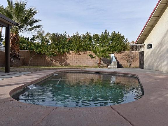 Great location!! Less than 3 miles to the 10 Freeway and Palm Springs. This home has a great layout. Open Dining & Living room. Kitchen & family room with fireplace and sliding glass doors to the pool. Main living areas & 1 bedroom have gorgeous tile floors! The primary bedroom has 2 large closets, dual vanity, soaking tub and sliders that lead to the pool. The pool has been redone with pebble tec finish a few years ago. Huge 2 car garage Fresh paint on the entire interior, sliding glass doors upgraded. Ready for your personal touches.