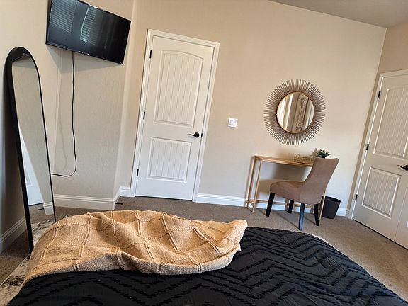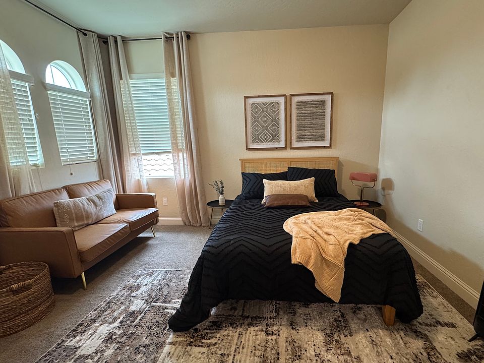This fully-furnished stunning boho chic bedroom is designed to offer comfort, style, and tranquility, perfect for a female medical professional/ student seeking a serene living space. Room Features: Elegant Design: The room boasts black bedding with plush pillows and a cozy throw blanket, creating a warm and sophisticated atmosphere. Natural Light: Three large windows with blinds and sheer curtains flood the room with natural light, enhancing the airy ambiance. Stylish Seating: A faux leather sofa, perfect for reading and relaxation, adds to the room's modern aesthetic. Dedicated Work Desk Area: Ideal for focused work or study sessions. Thoughtful Touches: A convenient nightstands with an eye-catching pink lamp for late-night reading sessions or ambient lighting needs. Nice Size Closet: Ample closet space to keep your belongings organized and easily accessible. Smart ROKU TV: Enjoy your favorite shows and movies Dedicated AC/Heating: The upstairs area has its own AC/heating system for your comfort. Private Full Bath: Enjoy your own spacious bathroom with lots of extra storage for all your essentials and extra belongings. Access to Kitchenette + Laundry Room: Enjoy the convenience of a well-equipped kitchenette featuring a small microwave, refrigerator, toaster, Keurig coffee machine, and a selection of dishware and coffee mugs. Additionally, take advantage of the washer and dryer for all your laundry needs. Home Environment: Our home is warm and welcoming, shared with my 9-year-old twins, a 2-year-old, and my mom, who helps care for the kids while I work. We also have two friendly fluffy dogs, both non-shedding and hypoallergenic. To ensure maximum privacy and comfort, tenants will not have access to the bottom floor, where our family and dogs spend most of our time. This setup helps create a peaceful and private living space for our tenants. Neighborhood: The property is conveniently located near major hospitals and medical facilities, making it ideal for healthcare professionals who need quick access to their workplaces. Enjoy nearby parks and recreational areas, perfect for unwinding after a long day, with beautiful walking trails and outdoor spaces. This area offers a variety of shopping centers, restaurants, and cafes for dining and entertainment. The neighborhood is known for its low crime rates and friendly community, ensuring a safe and welcoming environment. Non-Negotiables: While we prioritize comfort and a welcoming atmosphere, we must emphasize that smoking and drug use are strictly prohibited in our home. This policy is in place to ensure a healthy and safe environment for everyone. Nearby Amenities: Sierra Vista Mall: Just a 10-minute drive away, offering shopping, dining, and entertainment options. Clovis Community Medical Center: 2.3 miles away Community Regional Medical Center: 7.4 miles away Kaiser Permanente Clovis Medical Offices: 2.5 miles away Parks and Recreational Areas: Enjoy nearby parks for outdoor activities and relaxation. Non-Negotiables: While we prioritize comfort and a welcoming atmosphere, we must emphasize that smoking and drug use are strictly prohibited in our home. This policy is in place to ensure a healthy and safe environment for everyone. Other Important Notes: Must rent of at least 1 month and will be outlined on a signed contract. There is 1 parking space available in driveway. No visitors allowed.