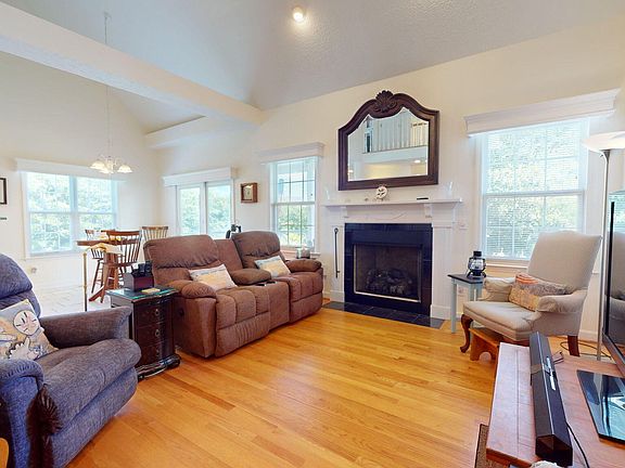 Tucked away on a cul-de-sac lot you will discover this absolutely beautiful 4 bedroom, 2.5 bathroom with bonus room in the popular community of NorthChase! Mature and meticulously designed landscaping frames the property and lines the pathway to the front porch. Upon entering, you are greeted by gleaming hardwood flooring and a 2-story foyer and living room. A formal dining room provides additional space for gathering or could be an optional main level office. The cozy gas log fireplace is the focal point of the open and bright living room with a vaulted ceiling. The kitchen is complete with granite countertops, built-in microwave, tile flooring and a breakfast room with architectural ceiling design. The owner's suite is located on the first floor and features a personal bathroom with double vanity, separate water closet, large soaking tub, step-in shower, tile flooring, and walk-in closet. Upstairs you will find a landing that is open to the living room, 3 more spacious bedrooms, a full bathroom, and a bonus room. The bonus room could be used as a 5th bedroom and the built-in shelves would serve well as a media room or office. Be sure to check out the hidden closet behind the bookshelf in the upstairs bedroom! There is plenty of storage, a laundry room, built-in shelving, shed, and 2 car garage. Just off the living room is the covered back porch with swing that's perfect for a morning cup of coffee or entertaining guests in the secluded backyard, admiring all the gorgeous flowering plants. Take a moment and smell the fragrance of your roses, gardenias, oleanders, and hydrangeas. Or take a dip in the community pool, play a game of tennis or basketball. There is also a playground, picnic area, pond for fishing, paved pathways and lots of community events. Close to shopping, dining, schools, and area beaches. You do not want to miss this one. Come take a look today!