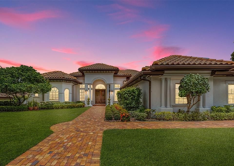 4-bedroom and 4 Bathroom and 4 car garage with a media room and a dedicated office. This custom-built home, lovingly maintained and build from the heart by the original owners. Luxurious Modern Mediterranean Custom-Built Home in Exclusive Windermere Community of HARBOR ISLE which is sought after. 0.66 Acre lot. Nestled in a prestigious gated enclave of just 38 luxury homes, this Mediterranean masterpiece offers an unparalleled living experience in Windermere, minutes away from the vibrant Dr. Phillips area known for its premier shopping and entertainment. This exquisite residences in the heart of town however it has the feel of a country home. As you enter through the magnificent custom mahogany door, you are greeted by the formal living room with breathtaking views of the screened-in infinity pool, complete with a jacuzzi tub and a cascading waterfall illuminated by a sophisticated lighting system. There is a real stone fireplace with hand painted art above that to make the feel of elegance in that room with the beautiful views. To your right there is your dining room. You can hear the sound of music from every room with owned top of the line surround system. The gourmet kitchen is a chef’s dream, featuring top-of-the-line appliances. Above the stove is a stunning real stone custom hood, and centerpiece and point of pride in this magnificent kitchen. Above the gas cook top, a custom hand-painted mural adds a unique touch of artistry and elegance. The exquisite custom Cherry Mohagany cabinetry, crafted with meticulous attention to detail, all a real wood for harmony and exude elegance and sophistication. A spacious island, dual sinks, and high-quality granite countertops make this kitchen ideal for both everyday cooking and entertaining. Additionally, two glass display cabinets are perfect for showcasing your special China. Further along, the luxurious primary suite is strategically located for ultimate privacy, offering serene views of the infinity pool and waterfall. The primary bath is a sanctuary of relaxation, featuring top-to-bottom Italian travertine stone for effortless maintenance. It has shower with the top-of-the-line Jacuzzi tub for relaxation and ample closet with custom shelving. The media room, designed for entertainment, features a built-in bar with a sink, a full wine setup, custom mahogany cabinetry, roomy enough where you can put a grand piano, perfect for intimate gatherings. This room and opens to the family room, which in turn offers access to the pool area, complete with a second real stone fireplace and a custom outdoor kitchen. This outdoor space overlooks both the lush garden with mature landscaping and the screened-in infinity pool, making it an entertainer's dream. The custom tile roof not only enhances the aesthetic appeal but also ensures durability for years to come. The home's flooring is uniformly laid with the highest quality Italian travertine throughout the house for conformity and harmony. Bedrooms are all covered with top quality real wood flooring. Every column and fireplace and Hood are from real stone. Experience the ultimate in luxury living with stunning views of the infinity pool from nearly every room, this residence offers a seamless blend of indoor and outdoor living, creating a truly remarkable oasis of comfort and elegant. This outdoor space overlooks both the lush garden with mature landscaping, Pool making it an entertainer's dream.