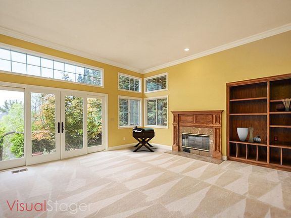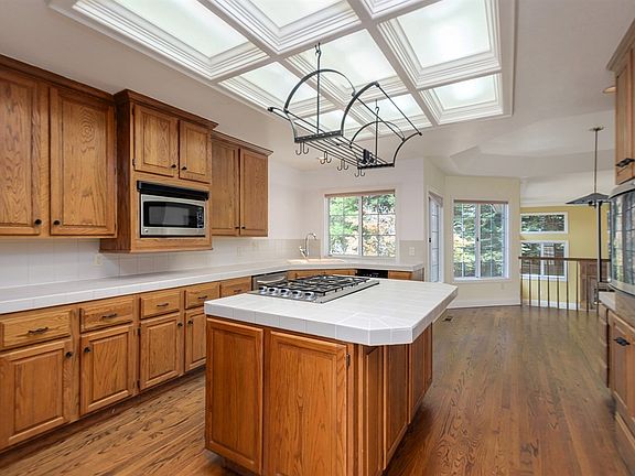 4 bedrooms + office; each bedroom has an attached bath; 3,500sf home on ½ acre. The chef's kitchen features designer stainless appliances, large island, breakfast nook, doors to a patio & freshly refinished hardwood floors. This spacious 'heart of the home' is open to family room w/extra high ceilings, French doors to balcony with views, fireplace, & built ins. The dining room is graced w/extensive millwork & French doors opening to a private dining patio. The dramatic living room features dual French doors opening to side yard, a fireplace, high ceilings, & a bay window. The office has extensive built ins, a door to the wrap around porch, & a dedicated half bath. Main floor master has a fireplace, sitting area, French doors to a private deck w/views, a spa bath & large closet with extensive built ins. Upstairs are 3 large bedrooms, 1 en-suite and 2 Jack & Jill. 3 car garage, many patios and balconies, views, back gate to hiking trails. ICE CREAM/ICED COFFEE CART SATURDAY 1:30-3:30!!!