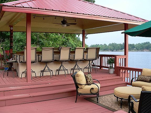 In addition to the main house property includes, a boat house with 3 small BR and 1 Bath. Also features a gazebo with outdoor kitchen, bar, propane gas fireplace with blue fire glass. The above square footage includes the main house and the boathouse combined. Lots of decking around the boathouse, bar and outdoor kitchen Sf is estimated for the decking.