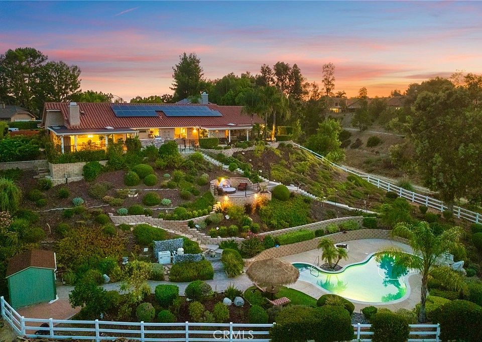 A rare gem in one of Temecula's most coveted neighborhoods evokes the essence of Tuscany with hot air balloons drifting over the hillside as you relax in your saltwater pool. This enchanting single-story home, complete with paid solar, rests on over half an acre at the end of a peaceful cul-de-sac, offering panoramic views of picturesque rolling hills. Step inside to a haven featuring 4 bedrooms and 2.5 bathrooms, perfect for both entertaining and everyday living. The Gourmet Chef's kitchen boasts beveled granite counters, a SubZero refrigerator, many new appliances with a gas cooktop and oven with convection and air fryer, a stainless steel dishwasher, and even a trash compactor. The open concept living and family rooms, featuring beautiful wood floors and beams, a cozy fireplace, updated lighting, cabinets, and a dry bar set the scene for delightful gatherings. Start your day with a cup of coffee just outside the master suite, accessible through sliding glass doors. The expansive walk-in closet has all the drawers and shelves your wardrobe could wish for. The master bathroom is a private oasis, featuring a custom walk-in shower with dual shower heads, dual sinks, and a soothing jetted spa tub. Outside, the 75-foot rear patio offers serene canyon views. Sip drinks at the tiki table, gather around the gas fire pit, or cook up a feast at the built-in BBQ island—perfect for summer fun and cozy winter nights. There's even room for your RV with a 14x39 gated parking space! With no HOA, energy-efficient windows, a new heater, AC, water heater, built-ins, fruit trees, grape vines and gorgeous creative landscaping, this home has been meticulously maintained and is ready for you to move in. Just minutes away from Historic Old Town Temecula, Pechanga Resort & Casino, and award-winning wineries, this property feels like a Mediterranean retreat. Come explore a home that has it all. The only thing missing is you!