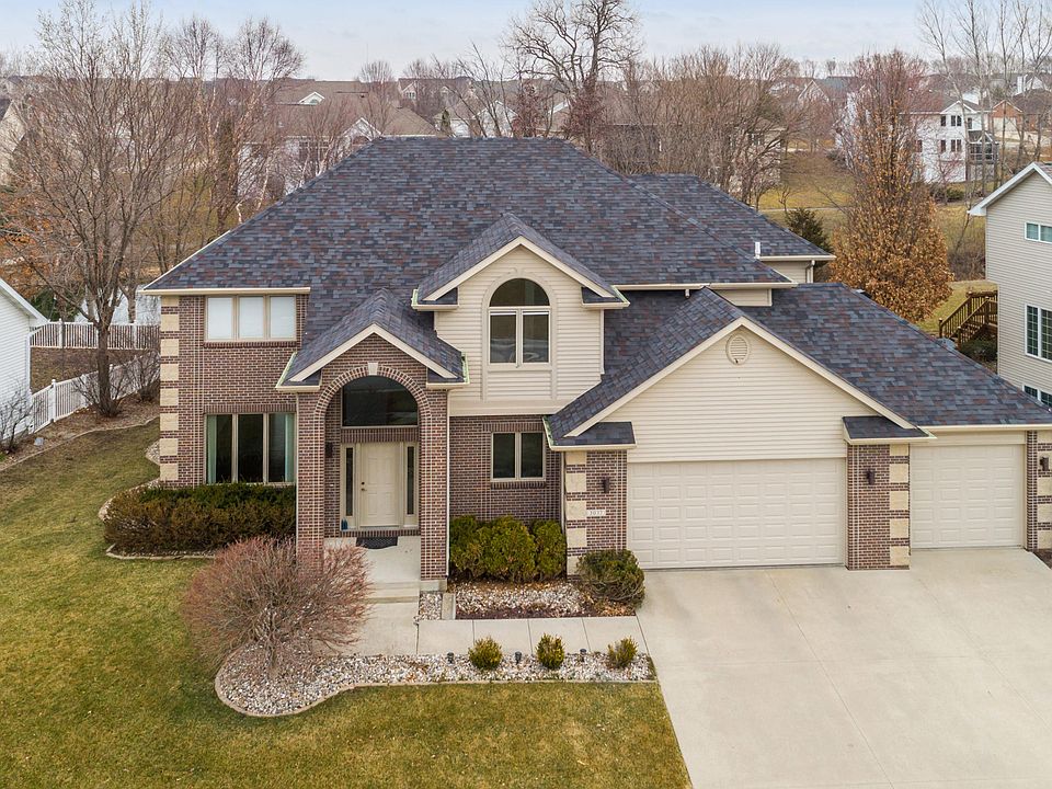 Executive home in Ames' premier Northridge neighborhood. This elegant 4 BR, 4 BA home has so much to offer. The front brick elevation, adorned with quoin stone corners, and 2-story open front entry sets the stage. Step inside the 2-story entry and enjoy the new Brazilian chestnut floors in the living and dining room. The updated kitchen makes cooking extra enjoyable. It features quartz marble patterned countertops with bar overhang and plentiful cabinets plus a hood fan venting to the outside. Informal dining area or the formal dining room offer space for entertaining and family. The 2-story great room has a gas fireplace flanked by custom made cabinets and bookshelves. The deck with view of a large pond makes for a tranquil gathering place during warm weather. The second level