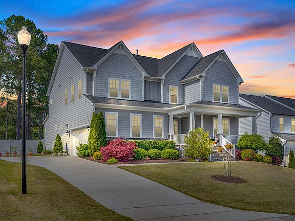Immaculate and move-in ready, this spotless 5 bed/4 bath home checks all of your boxes! PLUS a 1-Year Home Warranty & 1-year membership to Granite Falls Swim & Athletic Club included! Enjoy pools, lazy river, fitness, and more. Perched on a hill with greenway views, the home features a rocking chair front porch and an open main level with hardwoods, a chef's kitchen, and sun-filled living spaces with custom built-ins and elegant trim. The kitchen takes center stage with a gas cooktop, beautiful hood vented to the outside, double wall ovens, a huge center island, XL walk-in pantry, gleaming granite counters and upgraded cabinets (most fitted with pull-out drawers for easy access). There is a MAIN FLOOR GUEST SUITE with full bath (featuring a walk-in shower), plus behind the kitchen is a versatile BONUS room —perfect for office, playroom, or den. Thoughtful extras include a mudroom with cubbies and a side-entry oversized garage with epoxy floors & utility sink. Upstairs you'll find a bonus loft, 4 more spacious bedrooms all with walk-in closets, 3 more full bathrooms (including a Jack-n-Jill bath), a convenient laundry room with custom cabinets and Washer/Dryer included, and a luxurious owner's suite with spa bath and oversized shower. Enjoy the fenced, beautifully landscaped yard with deck, mature trees, and drip irrigation. Ideal location, location, location is walkable to nearby parks, trails, shopping & dining. Minutes to new Cobblestone Village, Main Street Park, Granite Falls Swim & Athletic Club, Walbrook Shopping Center (Publix, Five Guys, etc.), and downtown Wake Forest.