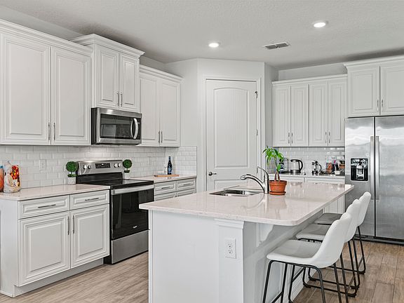 Modern 2022 model home featuring 10ft ceilings and driftwood plank tile flooring throughout (carpeted bedrooms).