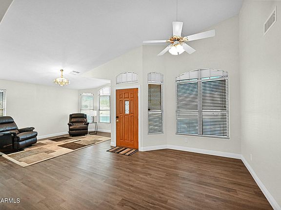 Beautifully updated home in a desirable East Mesa location! This spacious layout offers 3 bedrooms plus a den, 2 bathrooms, and a 3-car garage. Situated on a large corner lot with no neighbors behind, offering plenty of space and added privacy. As you enter this inviting home, you'll immediately notice the updated luxury vinyl plank flooring, 5 inch baseboards, and neutral paint throughout the entire home, creating a clean and cohesive look. The open-concept floorplan seamlessly connects the family room, dining area, and kitchen, making it perfect for hosting gatherings and spending time with loved ones while also featuring separate living and dining rooms. The kitchen is a chef's delight with beautiful granite countertops, tile backsplash, stainless appliances with double ovens, and a huge walk-in pantry. The primary suite welcomes you with a double door entry, roomy closet, separate exit onto the patio, and an ensuite bathroom complete with double sinks, an oversized shower, and garden tub. Two additional bedrooms provide comfortable accommodations for family members or guests, and the den provides a versatile space that can be customized to suit your lifestyle. The 3-car garage provides ample space for vehicles and storage, and ensures that you have plenty of room for all your belongings with built-in cabinets and a convenient garage sink. Outside, the well-manicured backyard offers a large covered patio, lush green grass, and 3 citrus trees.
