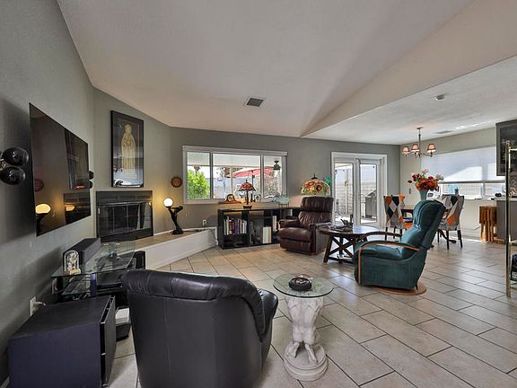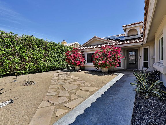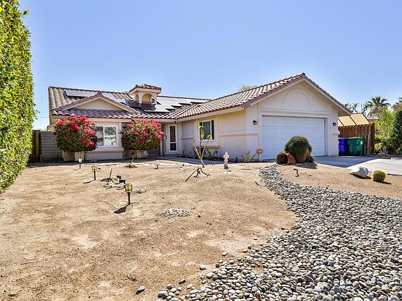 Welcome to this beautifully updated 3-bedroom, 2-bathroom (+ den/office) pool home, where comfort and style come together in perfect harmony! Nestled in a prime Cathedral City location, this home boasts a completely remodeled kitchen (2024)--a true showstopper! With sleek stainless steel appliances, double ovens, and a high-end fridge/freezer combo, even the most discerning chefs will be inspired.Soaring cathedral ceilings and stylish 12x24 custom tile flooring seamlessly enhance the open-concept design, while engineered hardwood floors in the primary suite add warmth and elegance. French doors open to an expansive covered patio, where you'll find a sparkling heated pool and spa--perfect for relaxing or entertaining. A charming grassy corner with fruit trees and a convenient walkway to the front gate complete the inviting outdoor space. Practical upgrades make this home as efficient as it is beautiful, including leased solar (buyer to qualify), newer doors and windows, and an ideal layout with the two guest bedrooms thoughtfully separated from the primary suite. The spacious primary retreat features a walk-in shower, double vanity, and a serene ambiance for ultimate relaxation. Plus, a versatile den/office/media room provides additional living space to suit your needs. A two-car garage and desert-landscaped front yard set the home back from the curb, allowing you to soak in breathtaking mountain views. This is the perfect home to embrace the best of indoor-outdoor living--don't miss this incredible opportunity!