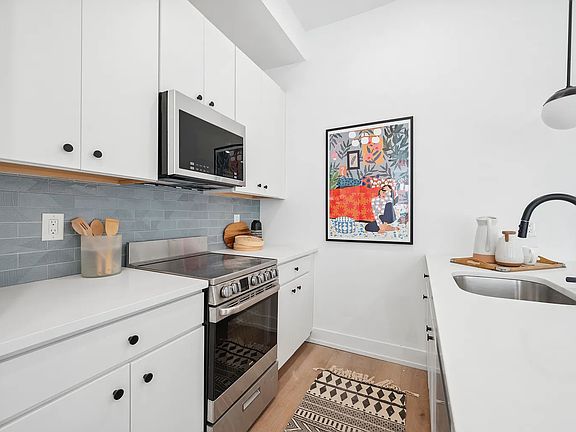 The modern kitchen is move-in ready and thoughtfully equipped with stainless steel appliances including a refrigerator, oven, microwave, freezer, and dishwasher making it easy to settle in and start cooking your favorite meals.
