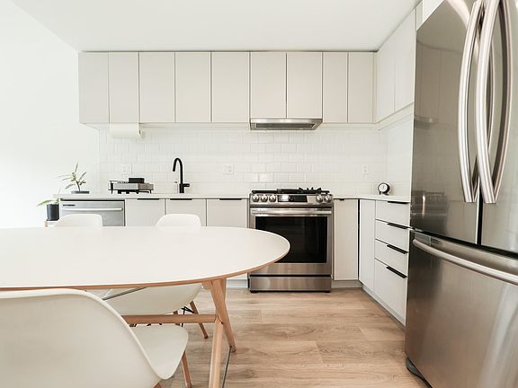 Large windowsModern kitchenStainless steel appliancesGas rangeQuartz countersSleek cabinetryVersatile den