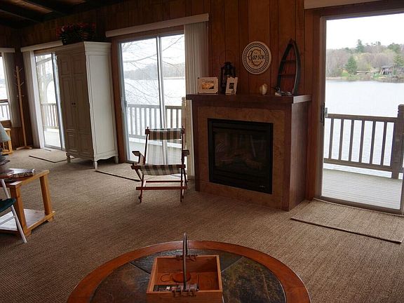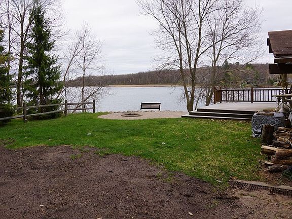 Sweet cabin on a beautiful pristine lake that has many bays. The cabin is situated on one side of a peninsula, so it's quite private. Master bedroom at lake level with a loft upstairs that sleeps six more. There is a brick on sand firepit overlooking the lake. The cabin has a new 200 amp electrical box with an electrical hook-up for a camper in the back yard. It also has a new terraced boulder wall with a bluestone stairway and a brick on sand sidewalk. Four sliding glass doors and a picture window in the master bedroom provide beautiful lake views. There are two baths: one half bath (up) and one shower(down). Wood paneled walls, ceilings, & a beamed ceiling (upstairs) provide a sense of warmth & coziness. A new furnace was installed to keep the cabin open year round, as well as air conditioning for the most extreme heat during summer months. A zero clearance gas fireplace was also added to insure extra warmth and ambience on the coldest days of winter. There is a brand new 'top of the line' gas range & cook top in the kitchen. The kitchen has granite countertops with a tile backsplash. The countertop also serves as an island that seats six people on bar stools. This cabin is used year around for ice fishing and snowmobiling. It has beautiful rip rap on the shoreline with boulder steps to both docks, as well as a boulder stairway from ground level up to the fire pit. The cabin has been routinely used for large groups (family of seven, plus in-laws and grand children) for the past 20 years. Only available because of retirement & consolidation from two homes to one. A wonderful place for water sports, games, making memories!