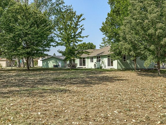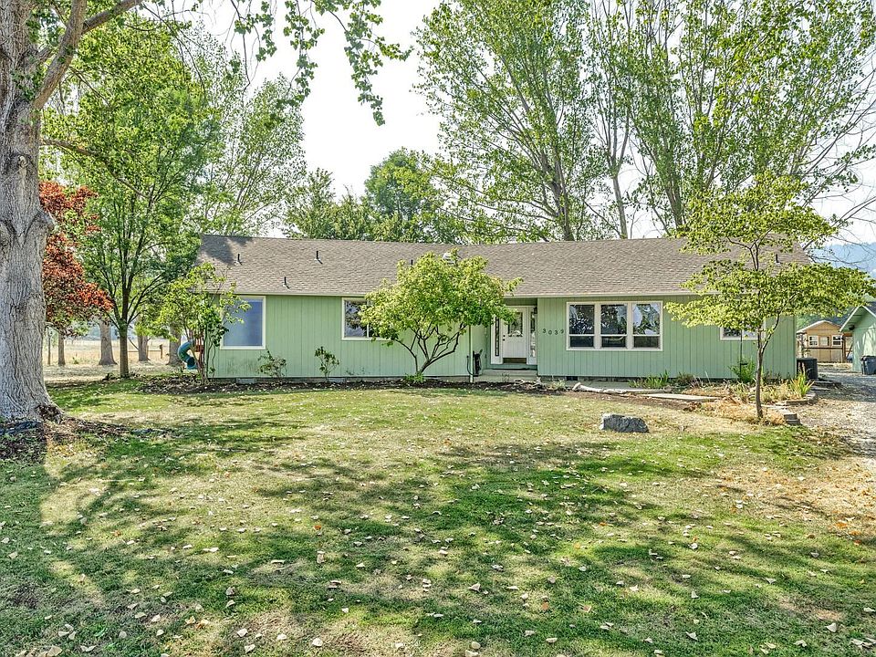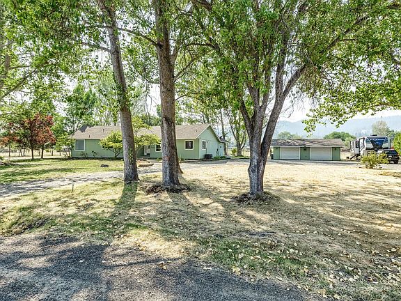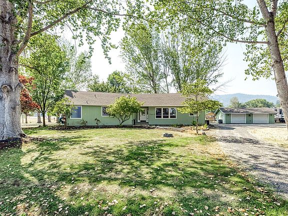 Country living at it's finest! This is a terrific 2,435 sq. ft.4 bdrm ,2 1/2 bath home on 2.45 acres on a quiet street in Central Point. It has a detached 768 sq .ft. garage that would be perfect for a workshop! The home has new flooring throughout, light and bright recently painted w/ beautiful views from the kitchen windows. The kitchen has newer appliances w/gas stove, DW & lovely white countertops. Both baths have 2 sinks & the master has a jetted tub & separate shower. Master bedroom has sliding door to the rear patio. Big living room w/ fireplace & adjacent family for home schooling or office. New water heater in 2022! Large rear patio w/tons of privacy. All acreage level w/Medford irrigation n fenced pasture New pressure tank & pump & softener in 2020. A chicken coop & boxed garden beds w/lots of beautiful trees for shade complete the picture! Circle driveway w/plenty of rm for RV's / toys! Solar pwrr & mtn views! Enjoy country life!