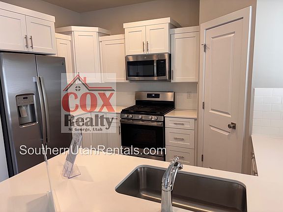 You'll love this northwest Cedar townhome in Cedar Bend, just off North Main Street and I-15 and minutes from all that Iron County has to offer! The beautiful kitchen has stainless steel appliances, quartz countertops, subway tiles backsplash, soft close cabinet doors and fridge! Heading upstairs you'll find 3 bedrooms and an upstairs laundry room with included washer & dryer. Forget lugging your laundry up and down the stairs! There is a fenced backyard and landscaping is provided! Home is ready for immediate move in! No smoking, no vaping, no pets. Tenant pays rent and also pays gas and electric. Water/sewer/trash is included in rent. Fridge, washer, and dryer are included.