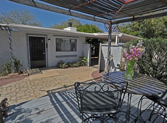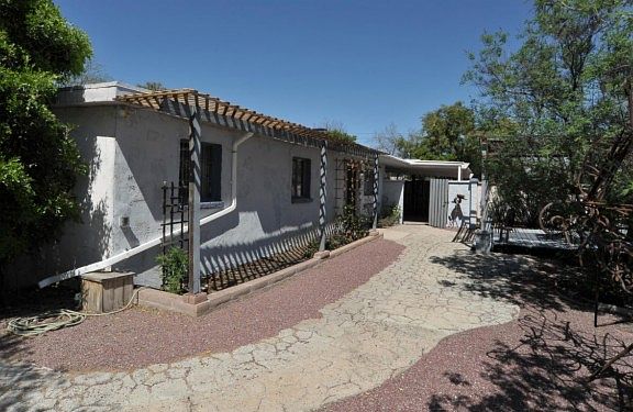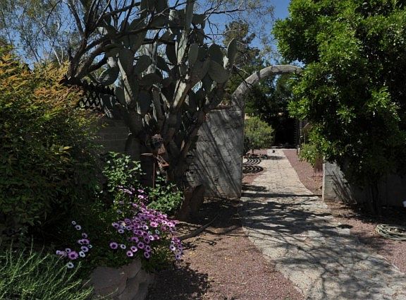 Nature lovers dream! This home has a charming front courtyard w/a large Ramada offering mountain views! Pathway wraps around the entire house w/lush flowering shrubs, vines & decorative rock & private sitting areas along the way. Home has upgraded electrical & new A/C, additional insulation on the exterior, wonderful custom tile & wood flooring throughout. Enjoy ceiling fans & wood burning FP in the living rm, charming den & family rm w/picture perfect windows of the yard. 1BR has electrical equipped to handle a sound studio. Enjoy the spa on the large wooden deck with adjustable shades. Lots of private settings amongst the flower beds & mature trees. Workshop has electrical, plus there are 3 additional storage sheds & 2nd workshop on the side yd w/electrical! Roof just re-coated!