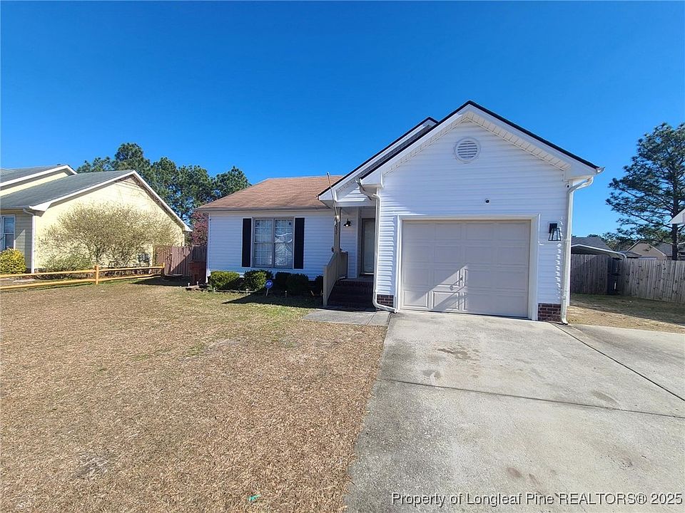Cute rancher in quiet neighborhood. 3BR/2BA home, with laminate floors in the living, kitchen and the master bedroom. Living room with fireplace. Nicely appointed kitchen and breakfast area. Master bedroom with bath and walk in closet. 2 more bedrooms with hallway bath. Fenced in rear yard with large shed with electricity and a single car garage. Open layout is very inviting. Close to shopping, restaurants and Fort Bragg. No Pets. Currently occupied until 02/28/25. Showings will start on 03/03/25.